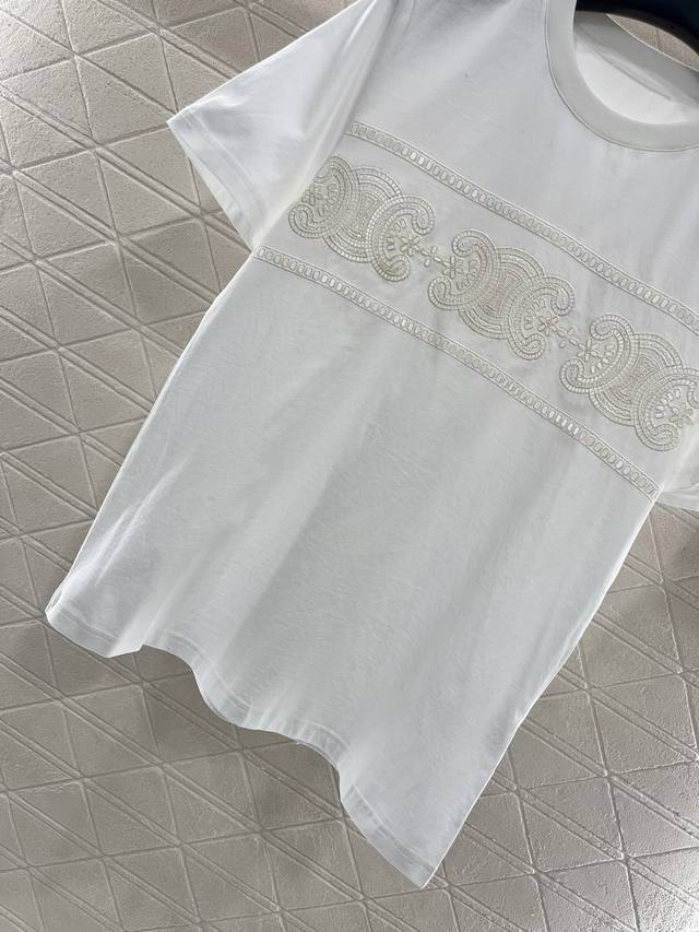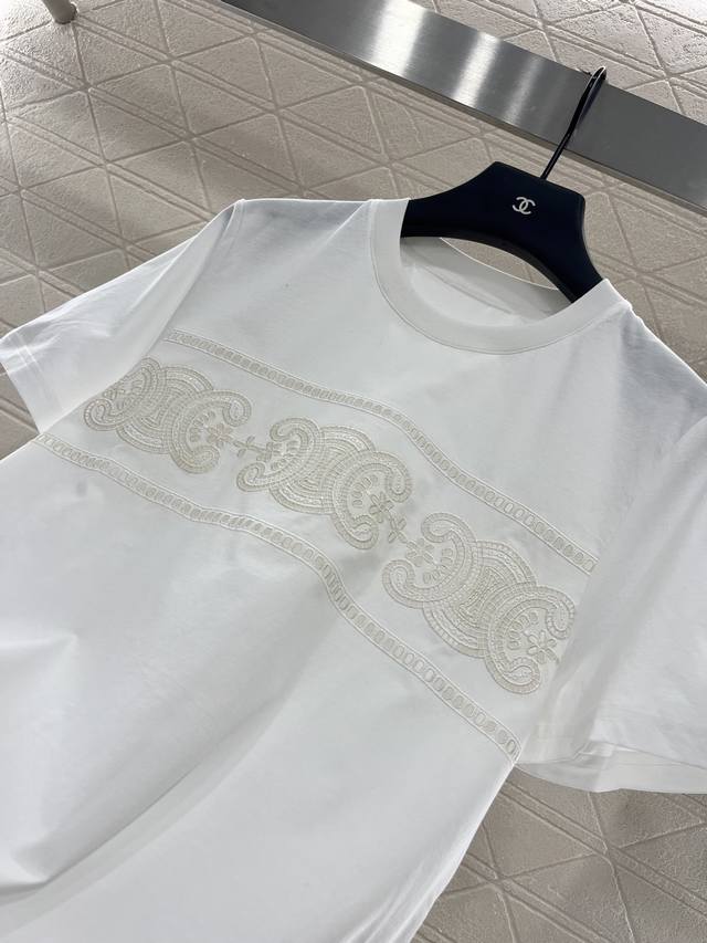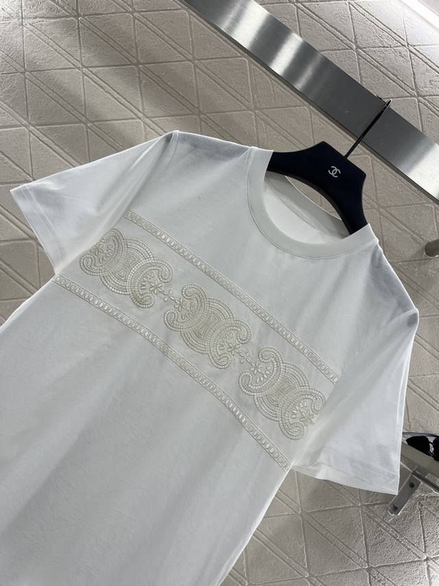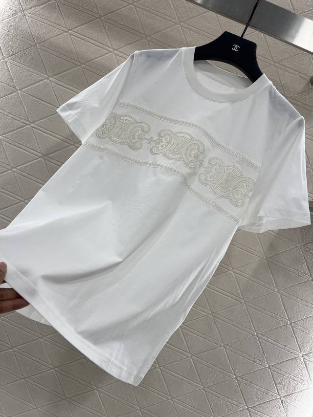 Celin* 2025 new arrival. This Arc de Triomphe embroidered, hollowed-out custom YB imported cotton poplin is lustrous, comfortable, breathable, and easy to wear. The regular short-sleeved T-shirt features a soft, stretchy fabric for a slimming effect. The fine texture and meticulous craftsmanship highlight the high-end design. The embroidered horizontal bars on the chest outline the Arc de Triomphe logo, along with the rich details and highlights, transform a simple basic style into a fashionable piece, showcasing a sophisticated style. It looks stunning worn alone or as a layering accessory. Stylish and custom-made fabrics and accessories are available in high-quality versions.