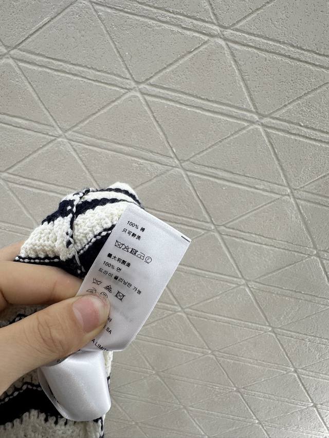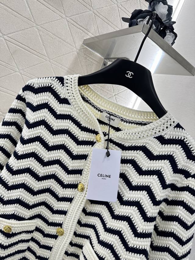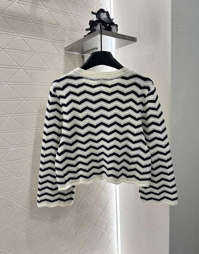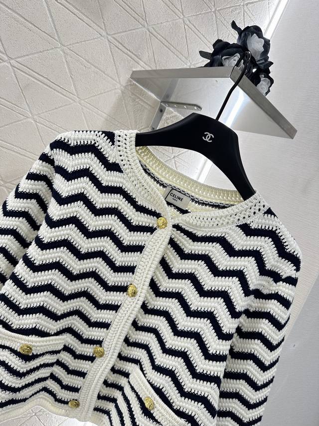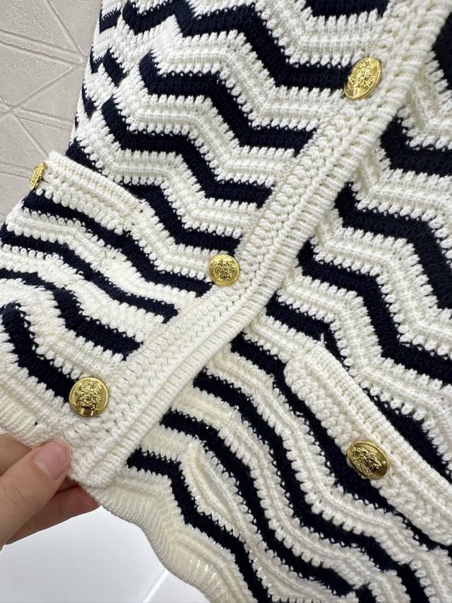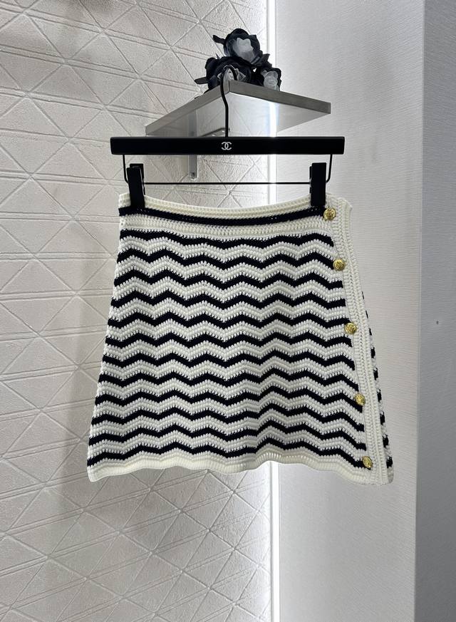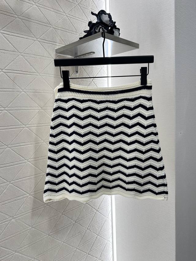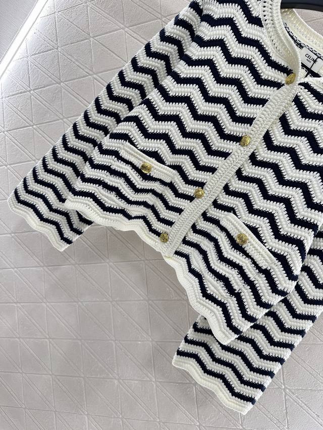 Celin*2025 new arrivals: Striped knitted cardigan and skirt set, custom-made with Yb cotton yarn. Soft and delicate, the knitted cardigan is paired with a skirt set. The upper and lower body design echoes the design, both embellished with printed buttons to highlight the brand's tone. The garment has a delicate and dense texture. The crocheted black and white wavy stripes collide with the cropped top, revealing the waist and proportions, showcasing the temperament. The retro style adds an elegant touch to the top. Paired with a straight skirt from the same series, the gold buttons on the side give it a refined and stylish look, perfect for dating or commuting. Custom-made fabrics and accessories, look for the high-end version of the cardigan skirt 200