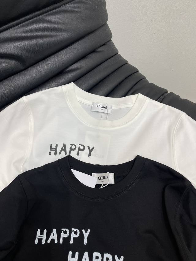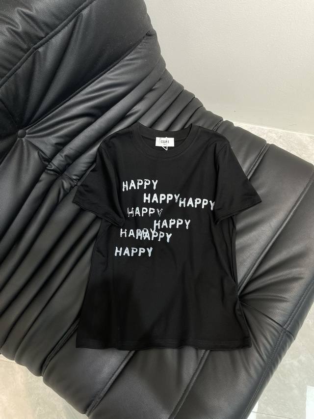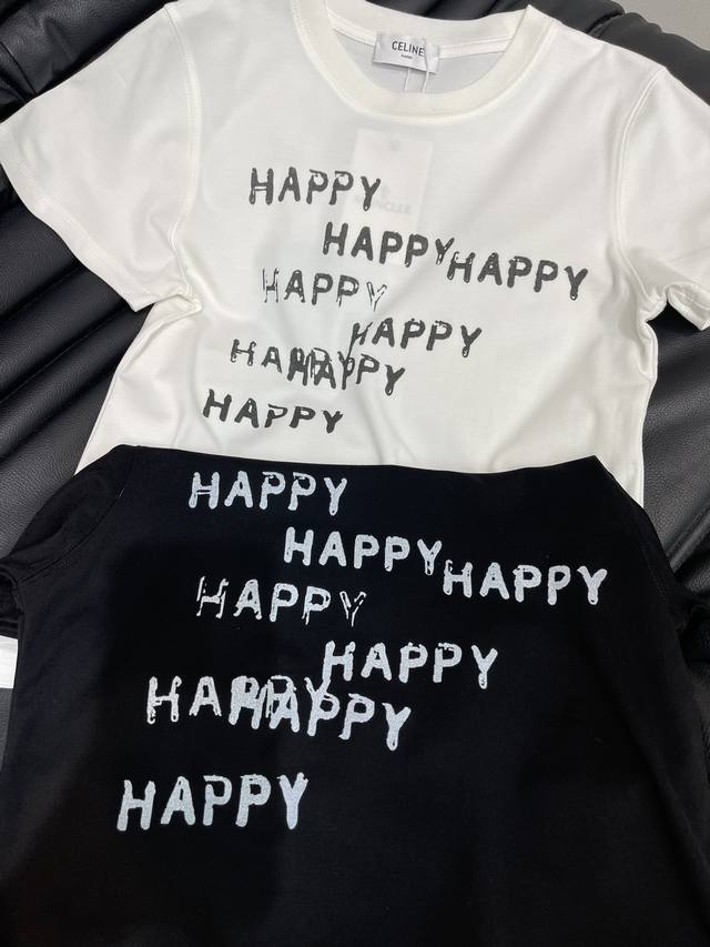 Celin*25 Spring/Summer new Happy lettering print short-sleeved T-shirt. Imported mercerized cotton fabric, classic fit, versatile and flattering! Sml Aa.