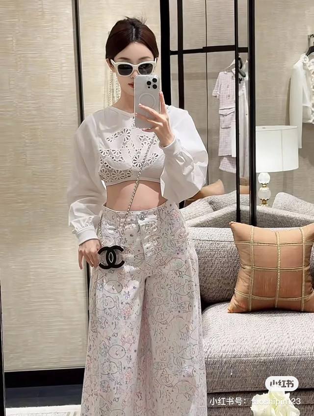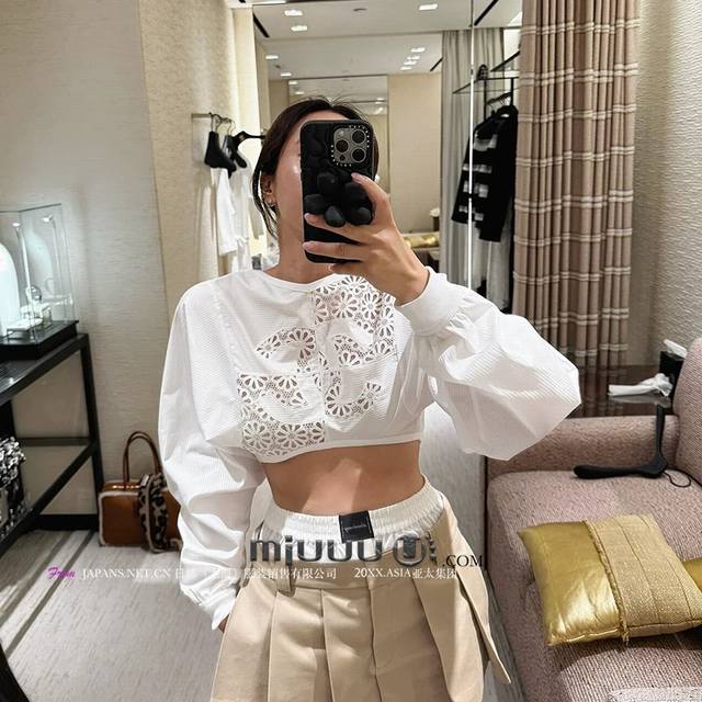 Chane* new style oversized double C letter logo water-soluble hook and loop hollow stitching back strap hot girl style sexy fashion belly button exposed long sleeve top! White, M size: bust loose, sleeve length 64, length 40