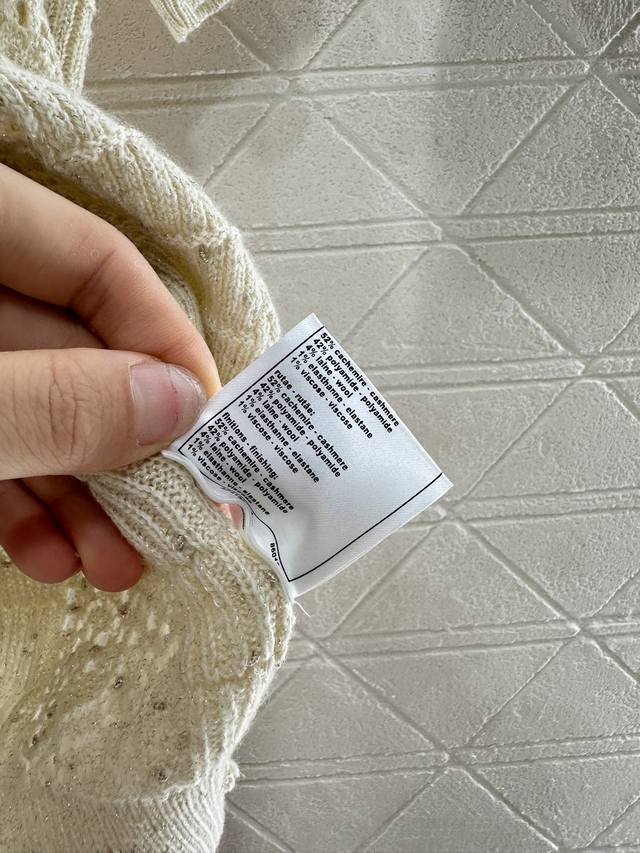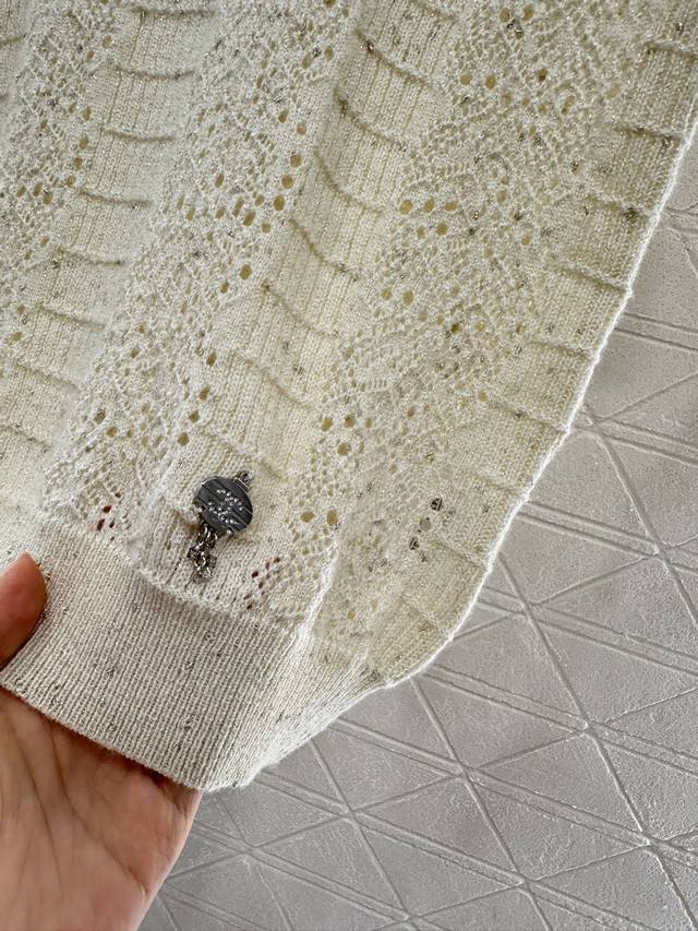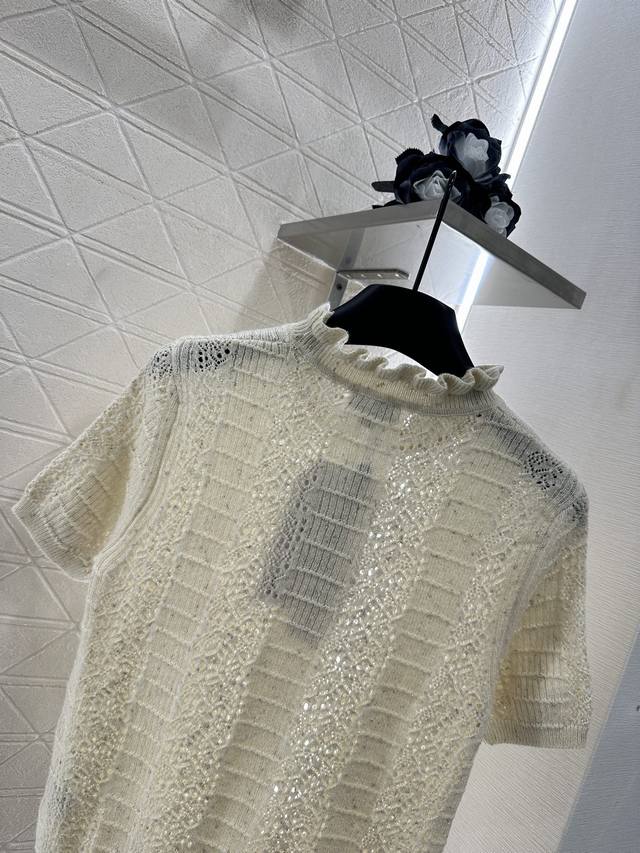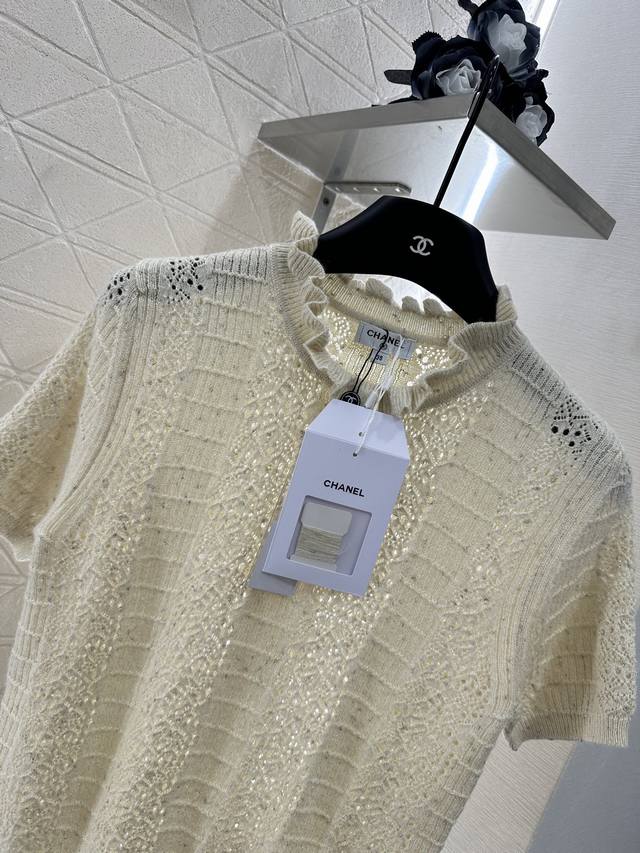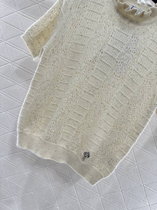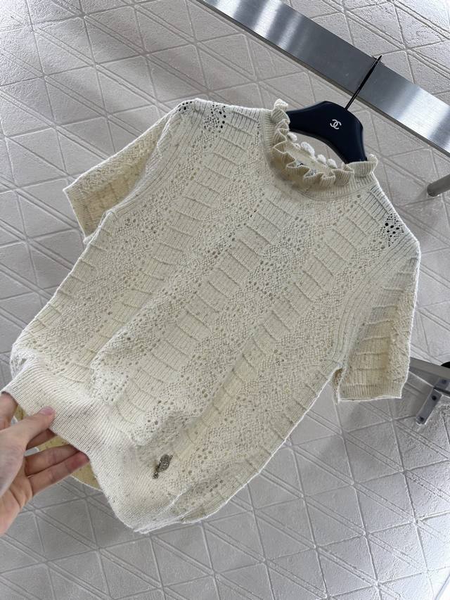 Chane*2025 New Arrival. A stand-up collar with a fungus lace detail and short sleeves. Custom-woven from Yb cashmere and wool yarn, this knitted short-sleeved piece features a delicate, soft, and stretchy design. The collar is detailed with a three-dimensional fungus pleated lace. This essential style complements the body, creating a fresh and light vertical hollow knit texture. The iconic double C logo is embellished with gold and silver thread, creating a retro, youthful, and relaxed look. This piece is easy to wear with custom fabrics and accessories. Look for the high-end version in three colors: 36, 38, and 40.