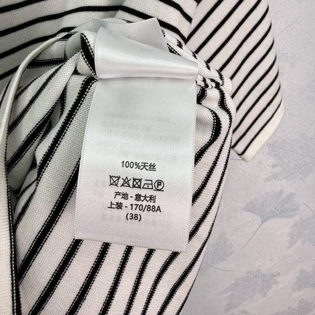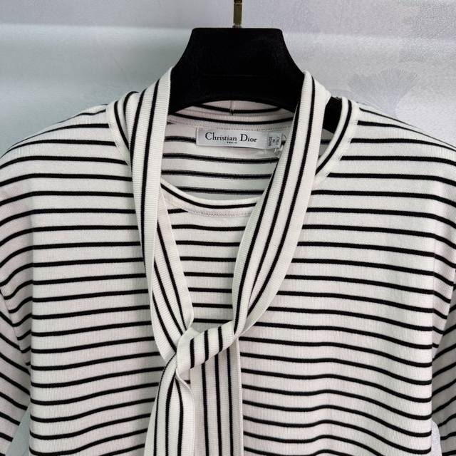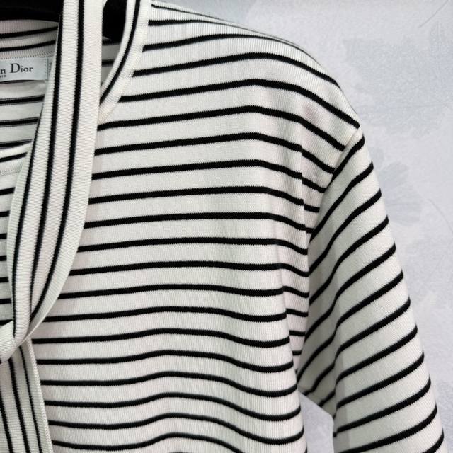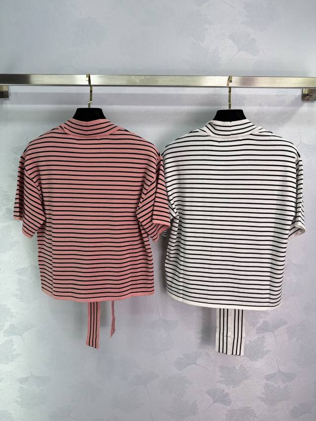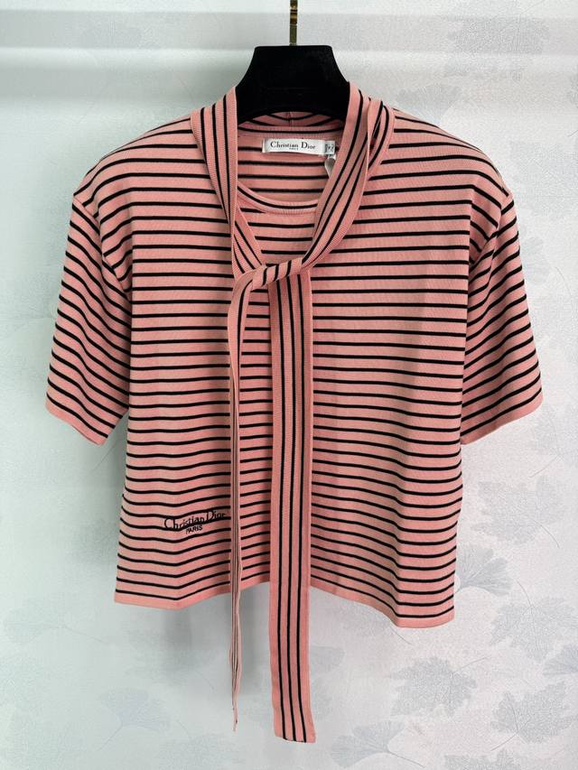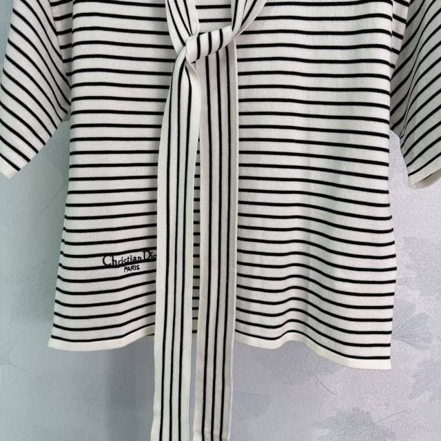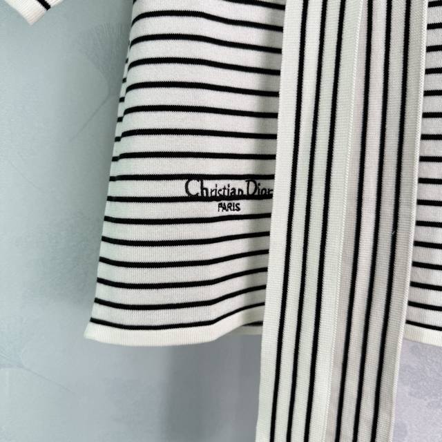 Dio*25 new spring and summer striped ribbon short-sleeved round neck design with a bow hem embroidered letter logo. Simple and elegant, suitable for daily commuting and dating. 2 colors and 3 sizes Sml T226B