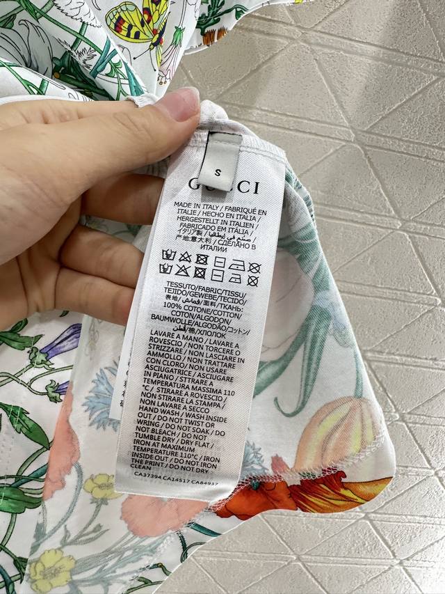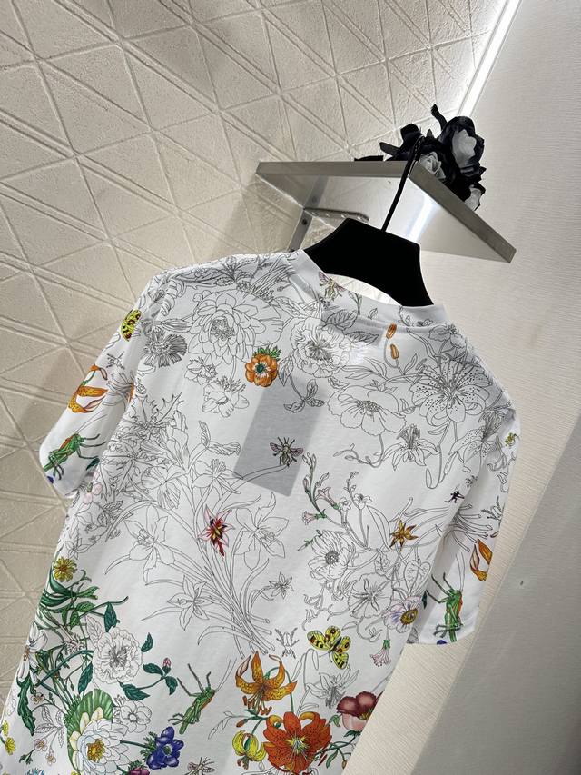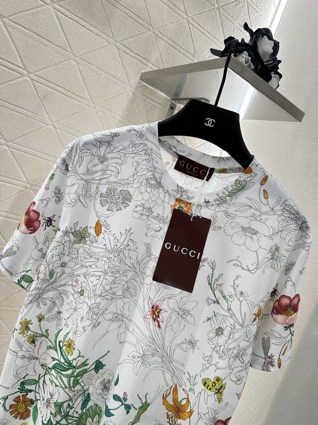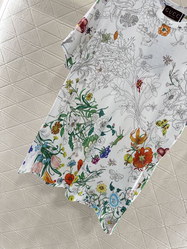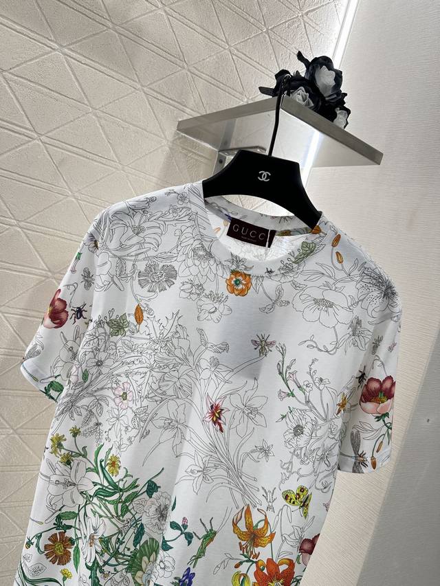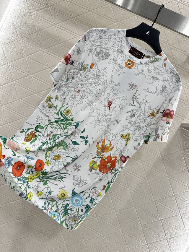 Gucc*2025 New Arrival. This printed, round-neck T-shirt is custom-made with YB mercerized cotton for breathability, comfort, and texture. The loose, short-sleeved T-shirt's cut highlights the brand's style. Made from heavyweight pure cotton, it offers a drapey, slimming effect. Developed by YB, this large, clear print creates a vibrant, gradient effect. The floral and leaf pattern contrasts with the plain white of the collar and cuffs, creating a stylish and effortless look. This creates a relaxed yet elegant look, creating a personalized look that stands out whether worn alone or as an inner layer. Fashionable and custom-made fabrics and accessories are available in high-quality versions.