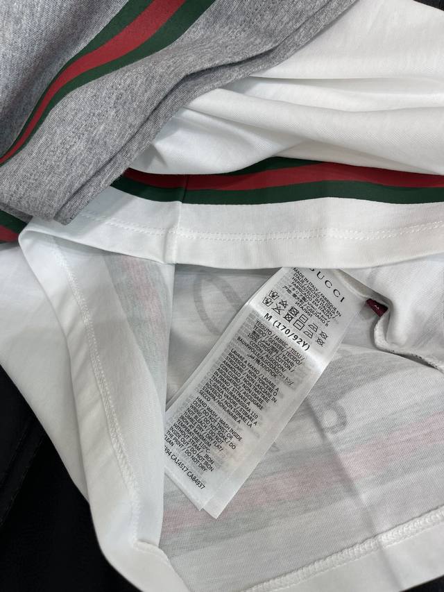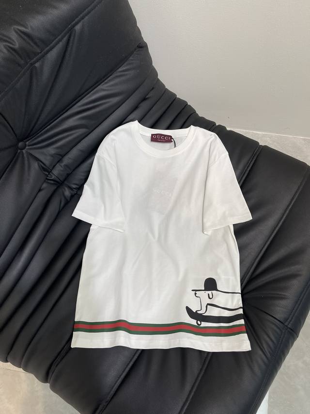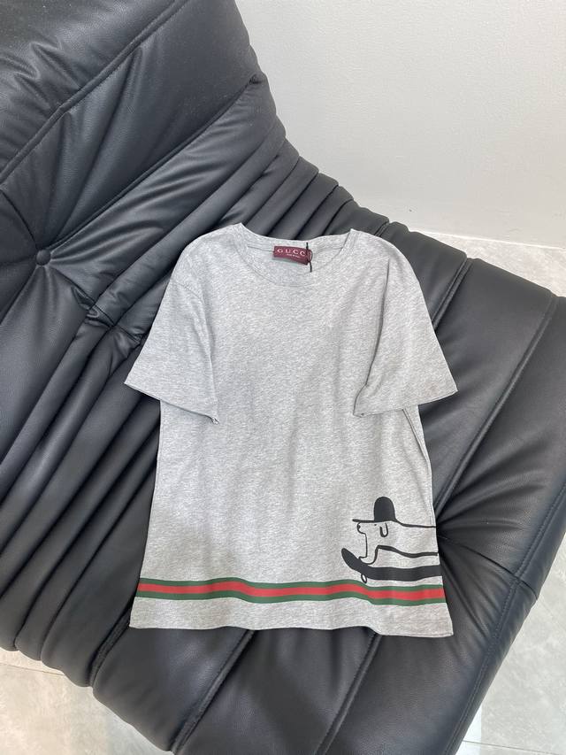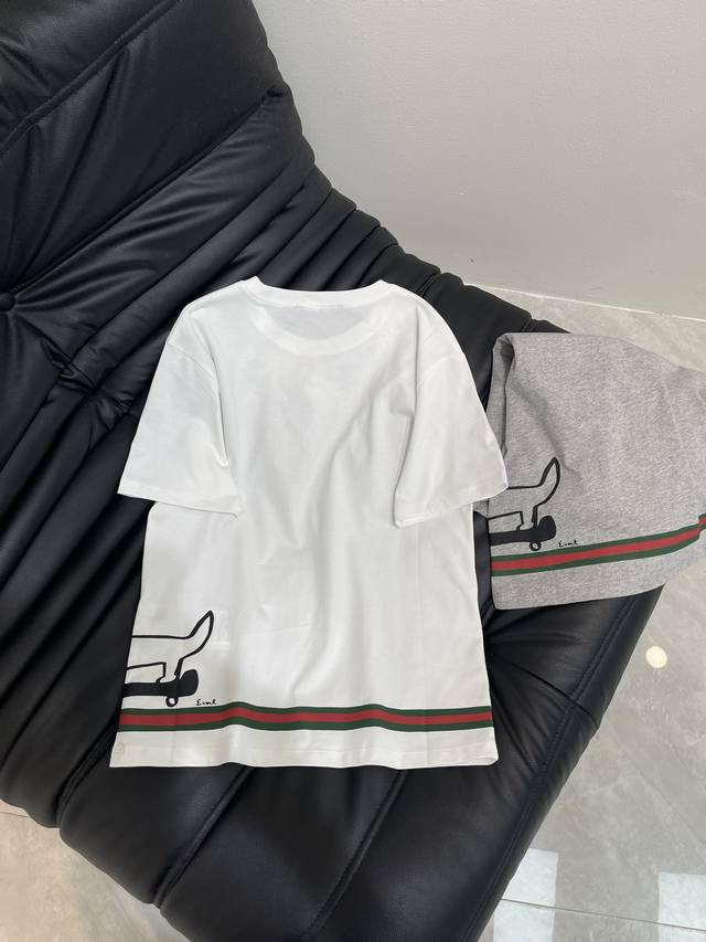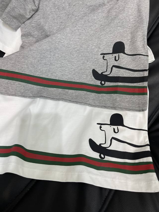 Gucc*'s new Spring/Summer 25 playful printed crew-neck short-sleeved T-shirt | Exclusive Yb development! High-quality fabric! The slim-fitting short-sleeved T-shirt highlights the brand's signature style. Made from heavyweight cotton, it drapes beautifully for a slimming effect. The Yb-developed piece features a white and gray hem, accentuated by a print and contrasting colors. A topper, skateboard, and dachshund pattern enhance the brand identity, creating a playful, cartoon-inspired look that's both youthful and stylish. Wear it alone or layer it under a layer. Sml Aa.