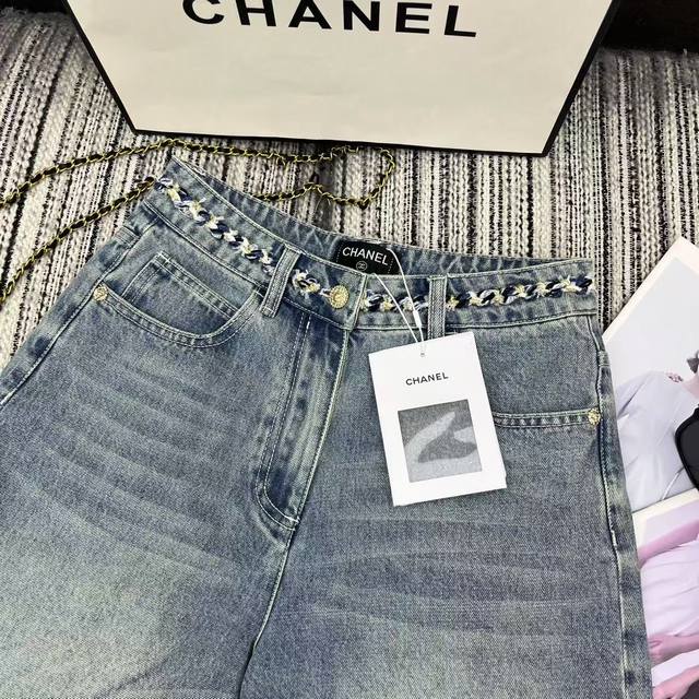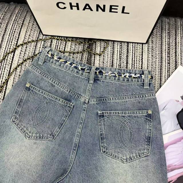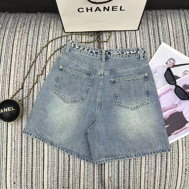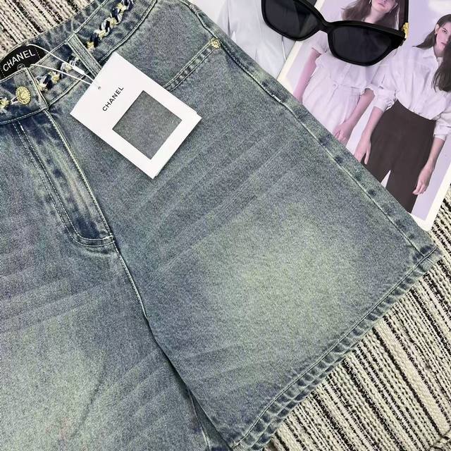 Highly recommended 25th spring and summer series Cha* new denim shorts with braided waist design, embroidered double C pockets, beautiful washed color Sml.