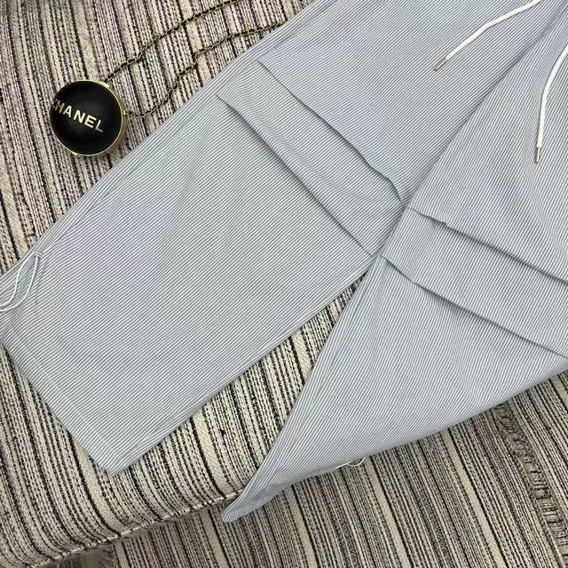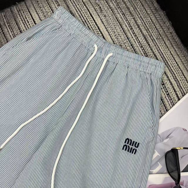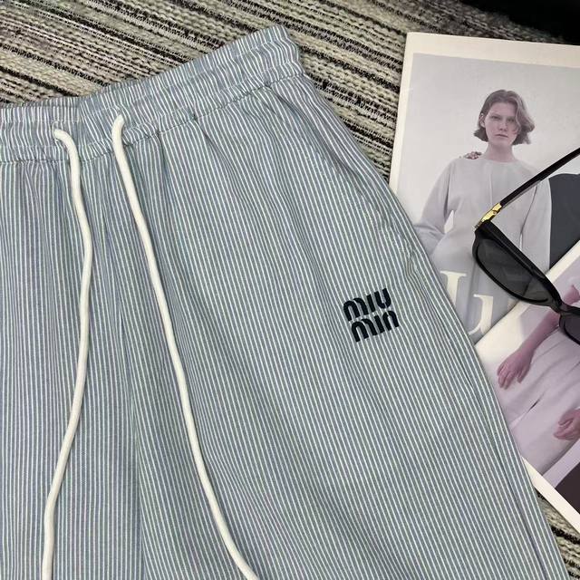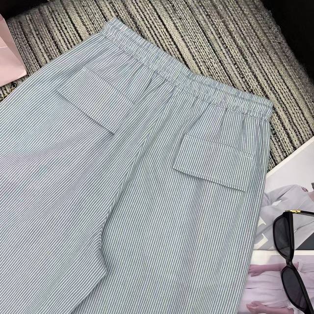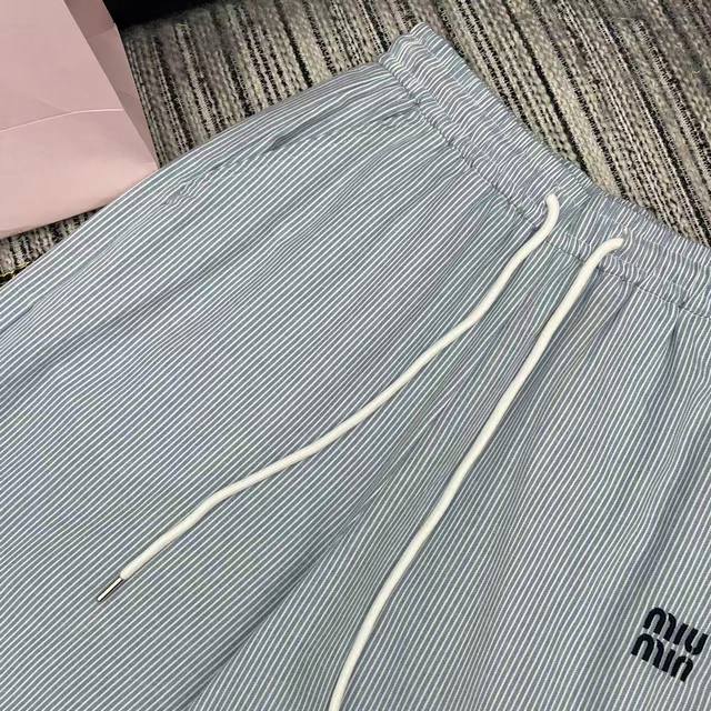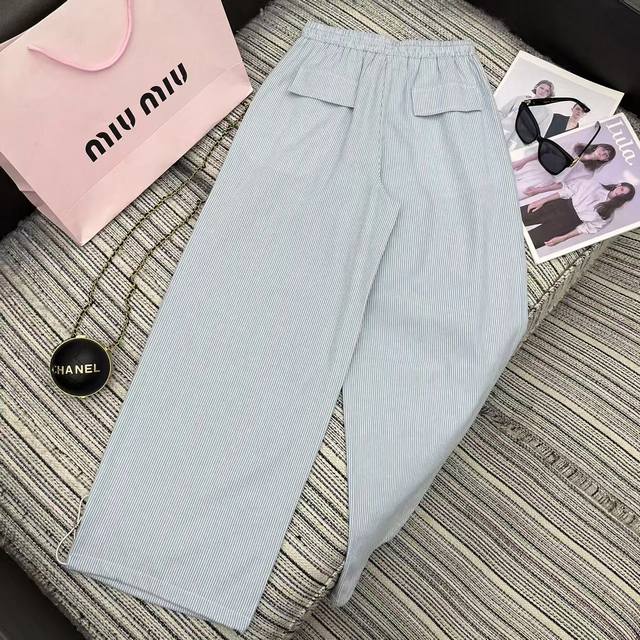 Highly recommended 25th year early spring and summer series Miu * new striped elastic waist wide leg pants drawstring trousers design embroidered letters embellishment Sml