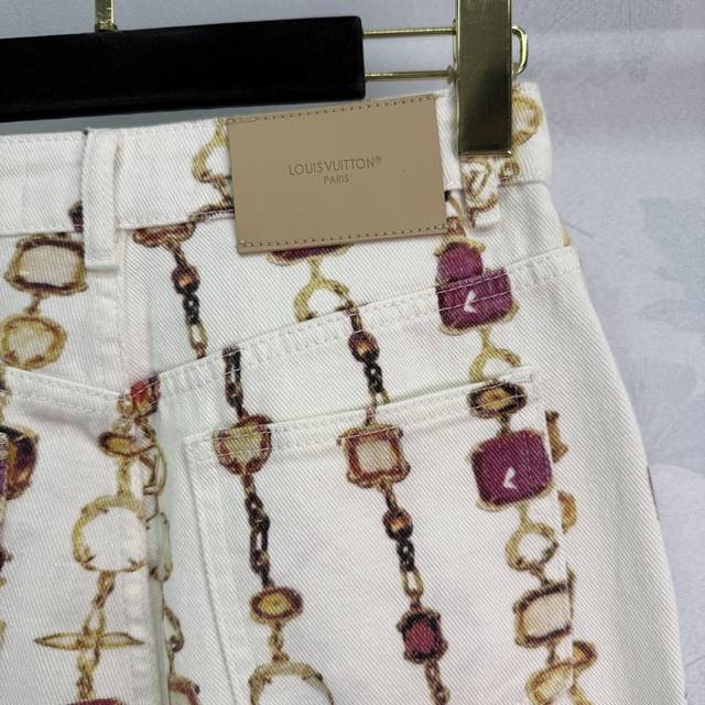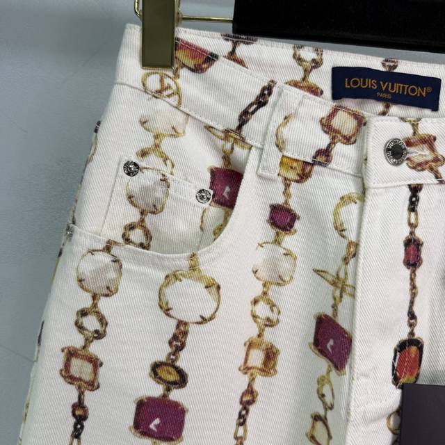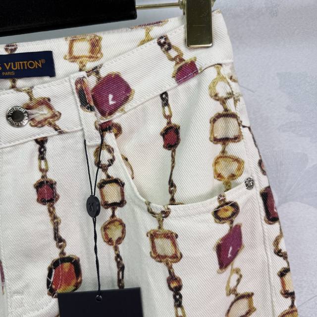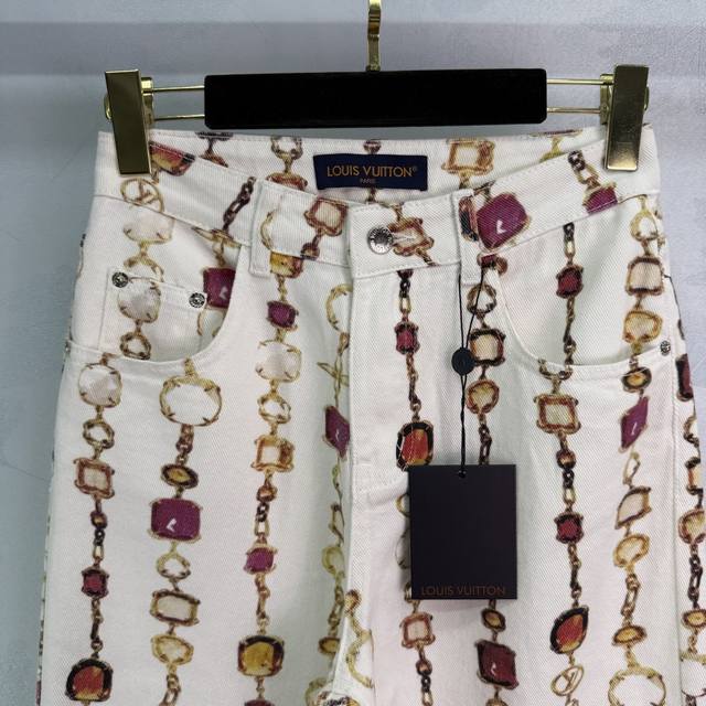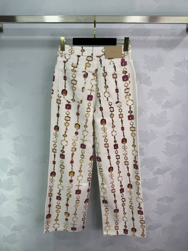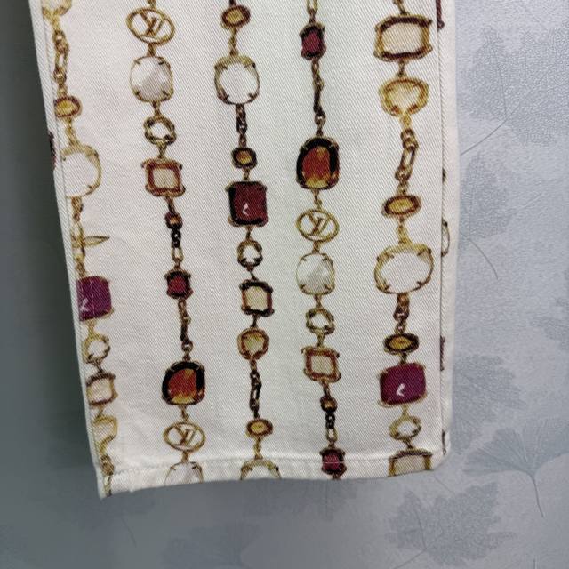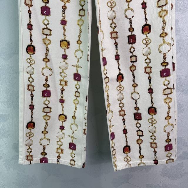 Louis Vui*Ton's latest 2025 Early Fall collection! Jeweled straight-leg jeans! Custom-made cotton twill denim with an enzyme wash, high-rise button-down design and a three-dimensional silhouette. A striking, premium white denim base is accented with vertical gemstone cuffs, creating a fresh and natural pattern. Interspersed with monogram logos, the intricate visual effect creates a stylish and understated look that showcases the brand's elegance. One color, three sizes. Sml T226B
