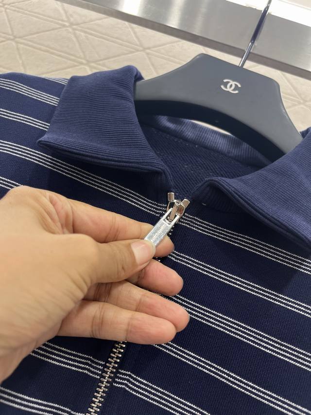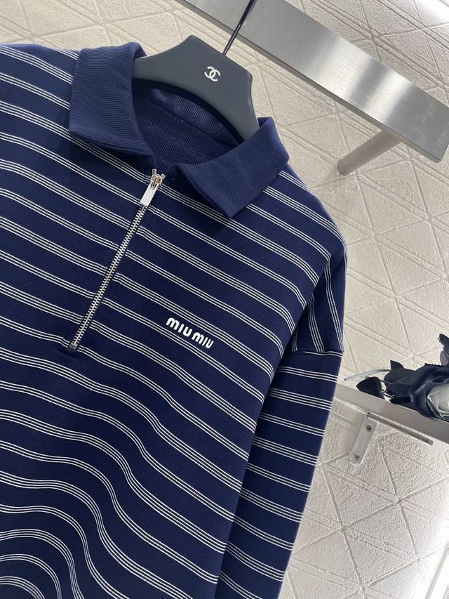 Miumi*2025 new arrivals: striped long-sleeved tops, custom-made from Yb virgin cotton. Made of stretchy, comfortable, and textured material, the top features a lapel and dropped shoulders for a loose fit, creating a relaxed, laid-back look. The all-over blue and white stripes, alternating in thickness, feature a zippered, half-open placket for added aesthetic and a casual feel. Looks stylish when worn alone or as an inner layer. A stylish, lettered logo accentuates the brand's style, creating a fashionable and fashionable look for both men and women. Custom-made fabrics and accessories are available. Look for the high-end version.