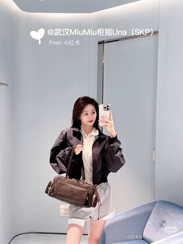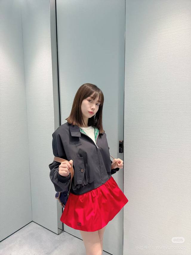 Mium*U 25 new patch logo short bread jacket. Original development high version! Plaid lining contrast color matching visual more prominent casual short age-reducing all-match super good-looking classic version with chest logo letter decoration easy to shape Yb hardware accessories details are very plus spot Sml