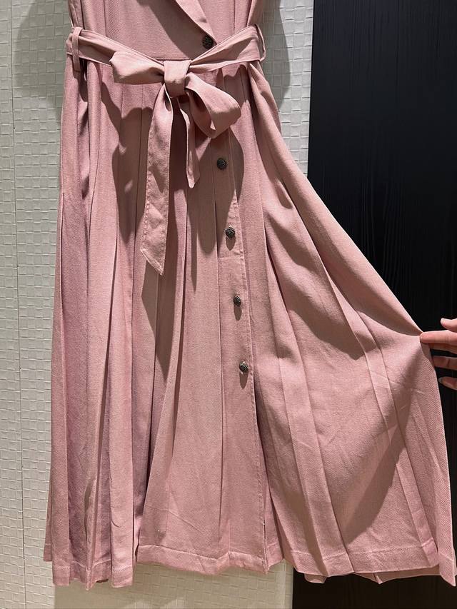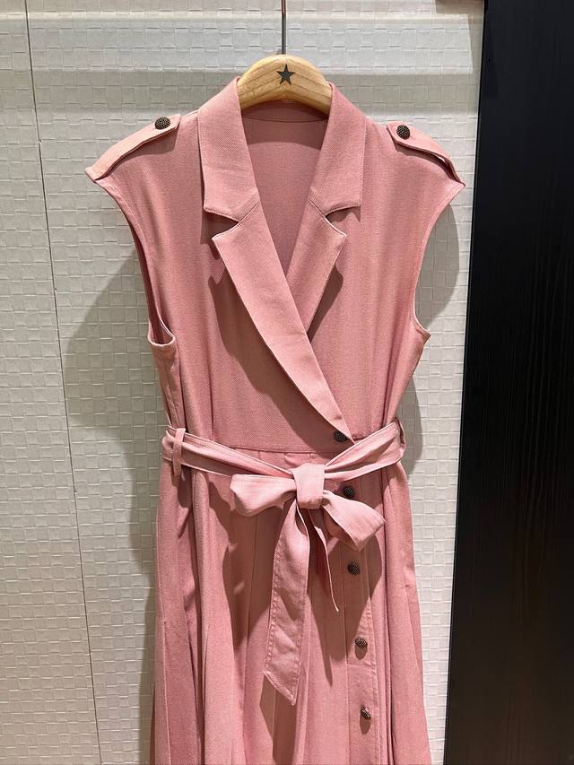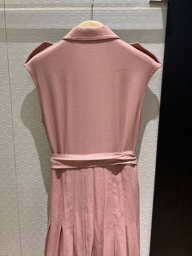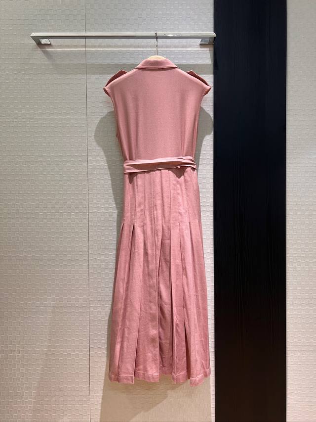 New arrival Lp pink suit collar vest style linen dress long skirt shoulder badge design splicing pleated skirt belt waist slim commuting temperament fashion lady Sml