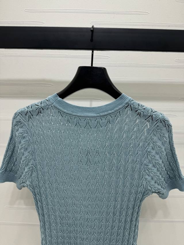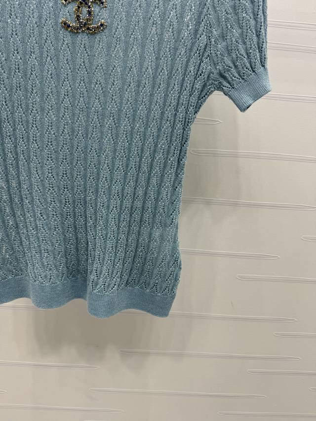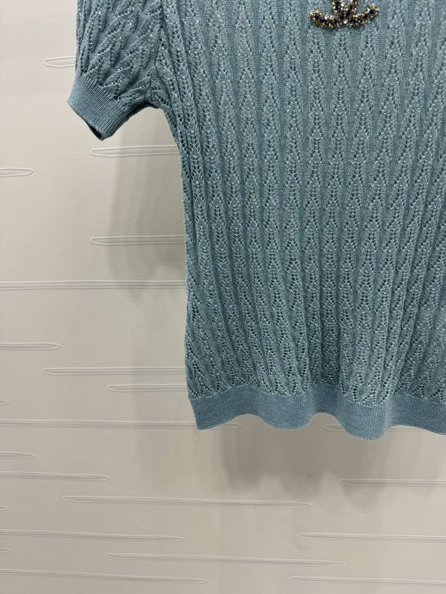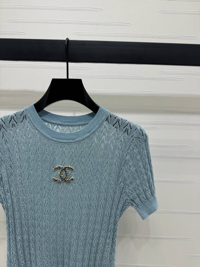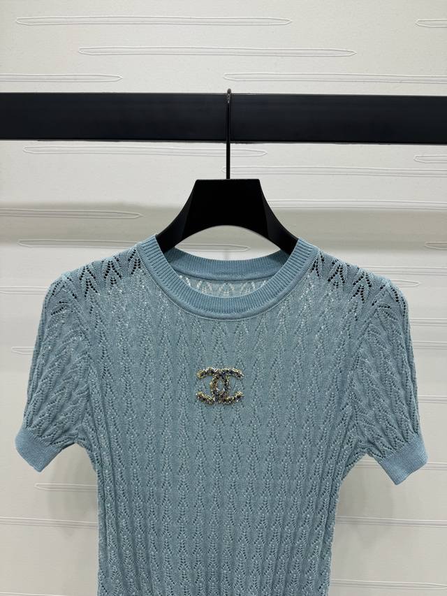 New original high-end quality Chane* 2025 spring and summer latest series! Round neck double C knitted short sleeves! Customized Yb imported silk and wool yarn material woven texture high-end and comfortable vertical pits throughout the body hollow texture interweaving with diamonds on the chest double C three-dimensional logo pattern can better show the exquisite temperament and highlight the high-end sense of wear. Elasticity makes it more exquisite. It makes you look thin and relaxed. Light luxury and fashionable temperament can be worn alone or in layers. The first choice for fashionable wear in all seasons! 3 colors! SM-L3 size! High-quality large goods A706B270C