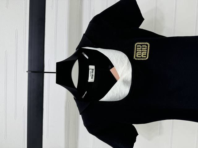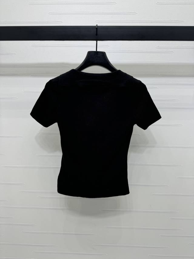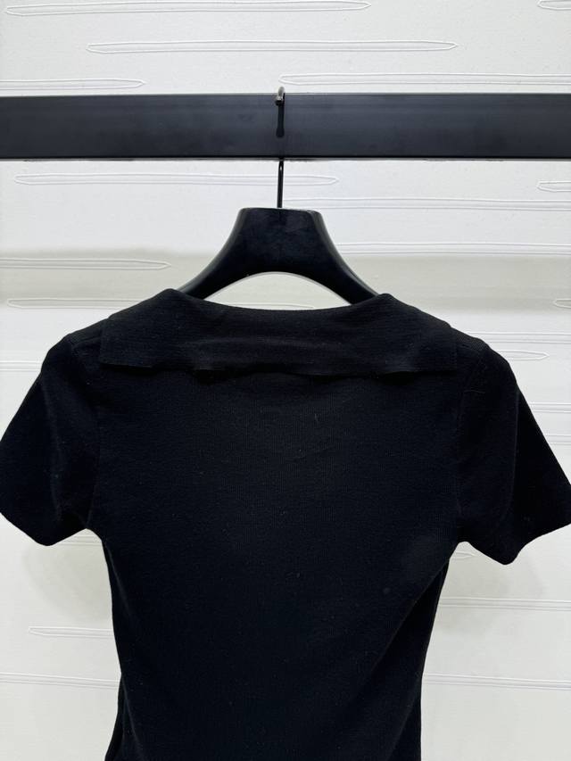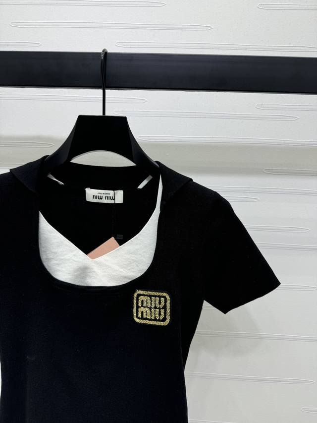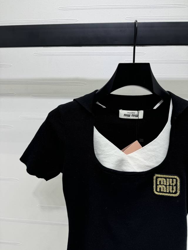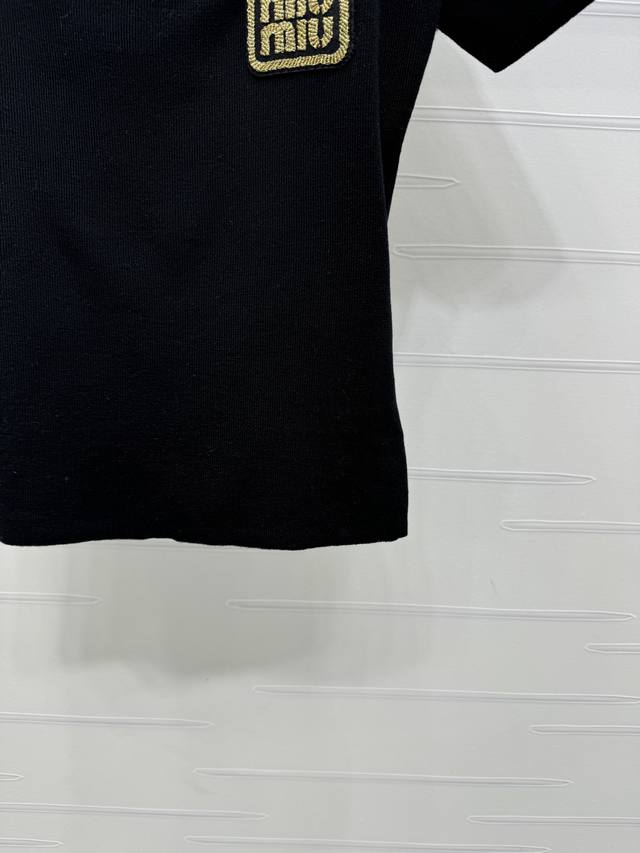 New original high-end quality Miumi*2025 spring and summer latest series! Shawl collar knitted short sleeves! Custom wool yarn weaving texture elastic breathable knitted short sleeves cut square collar shawl knitted short sleeves neckline adds halter straps to create a visual effect to highlight the high-end feeling of wearing elasticity and tightness to make it more refined. Slimming style slim elasticity and inclusive body shape show a relaxed tone. The heavy beaded badge logo on the chest highlights the light luxury and fashionable temperament! 2 colors! SM-L3 size! High quality large goods A706B330C
