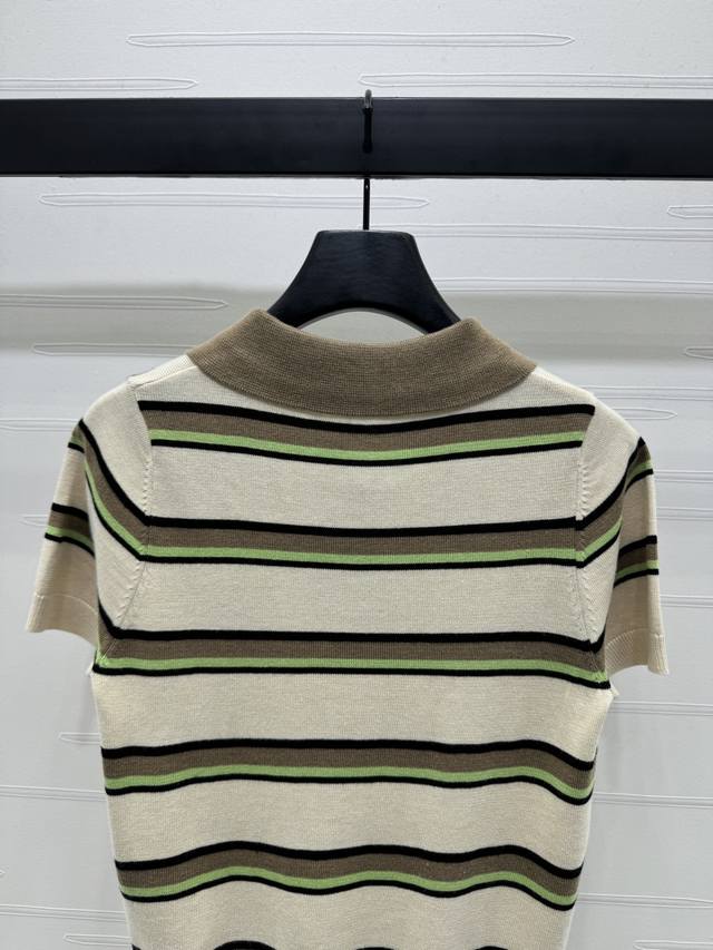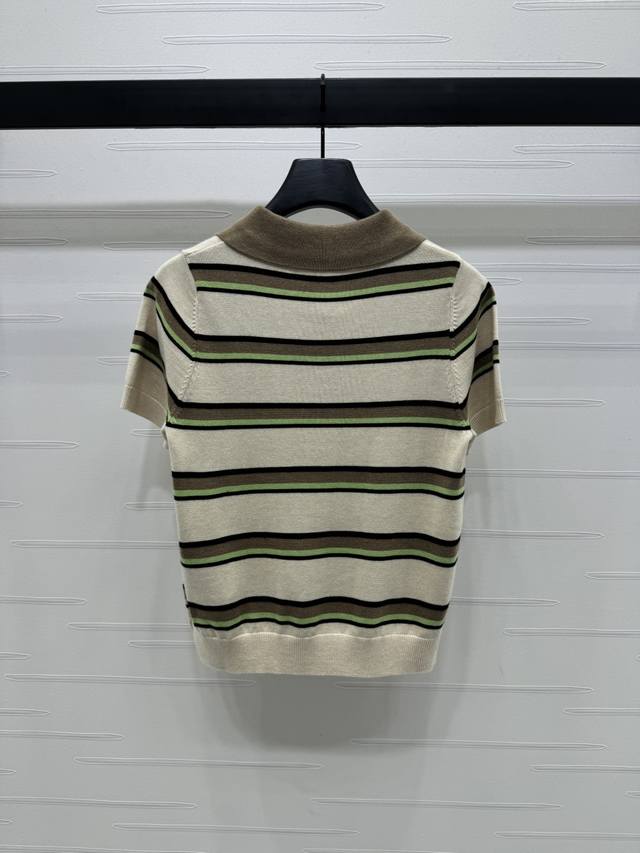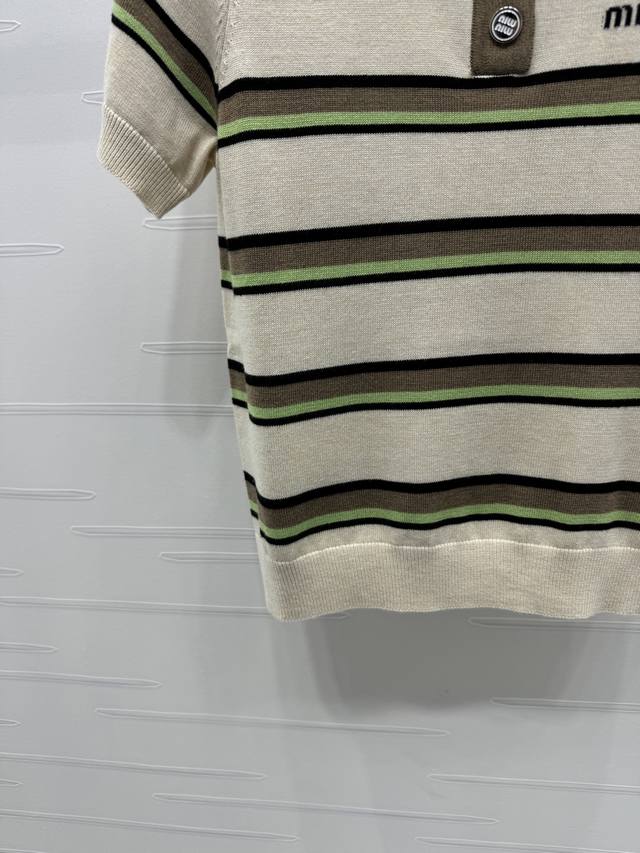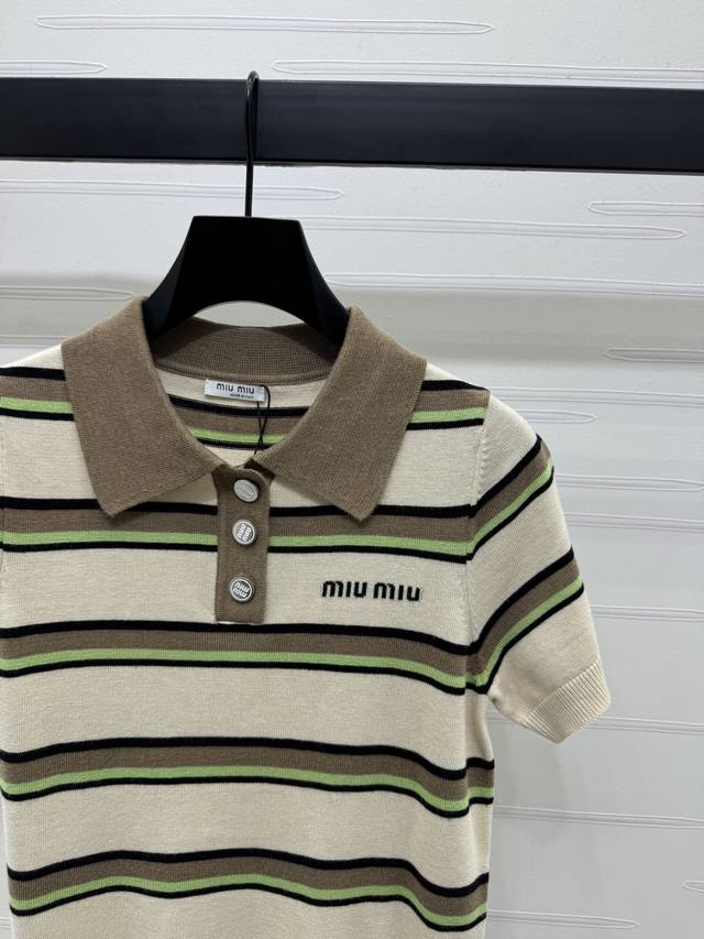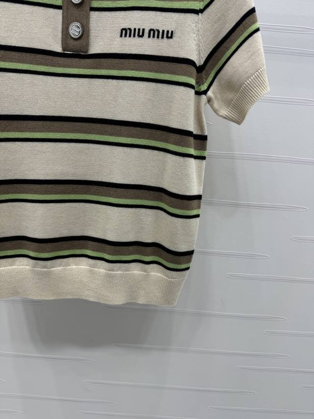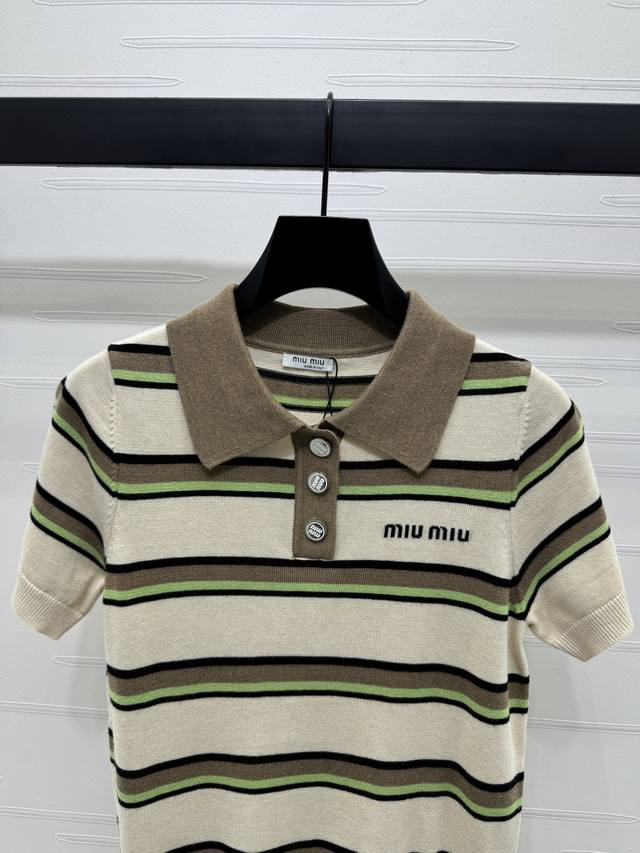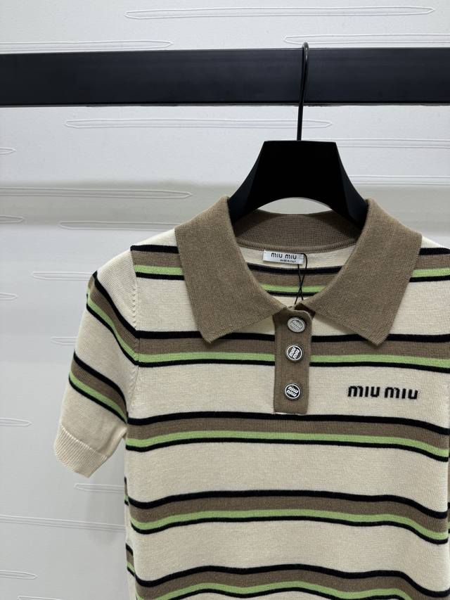 New original high-end quality Miumi*2025 spring and summer latest series! Striped lapel knitted short sleeves! Custom wool yarn weaving delicate texture breathable and comfortable lapel button opening can be adjusted appropriately to expose the skin. The whole body stripes contrast color letter logo on the chest shows the brand tone. The style is versatile and does not pick age and skin color. The upper body is suitable for reducing age and fashionable style! 3 colors! SM-L3 size! High quality large goods