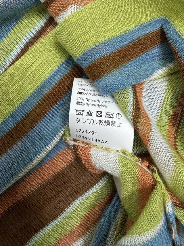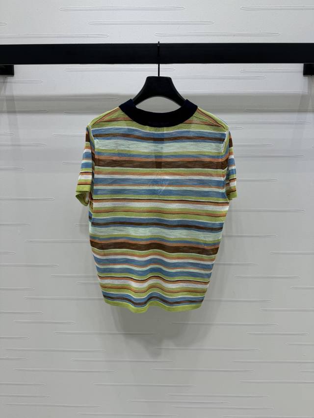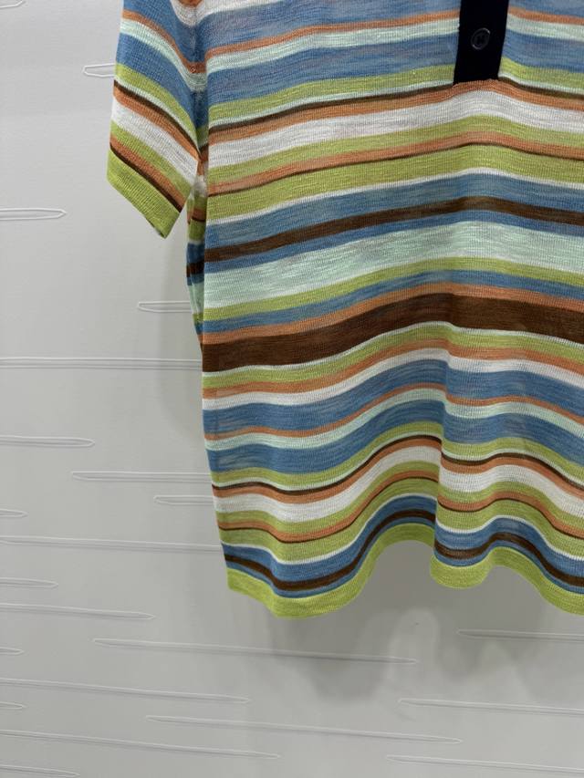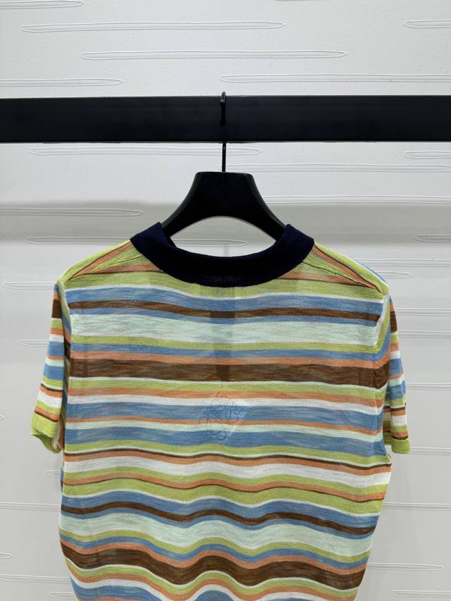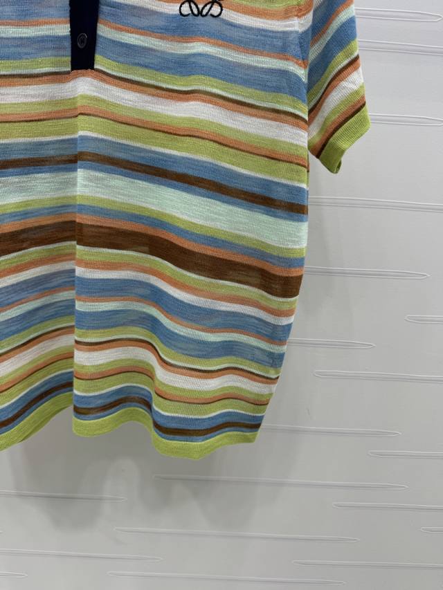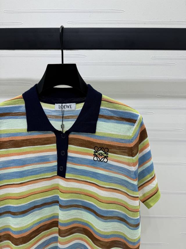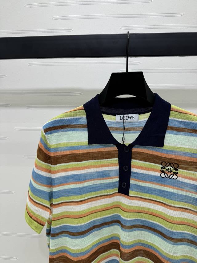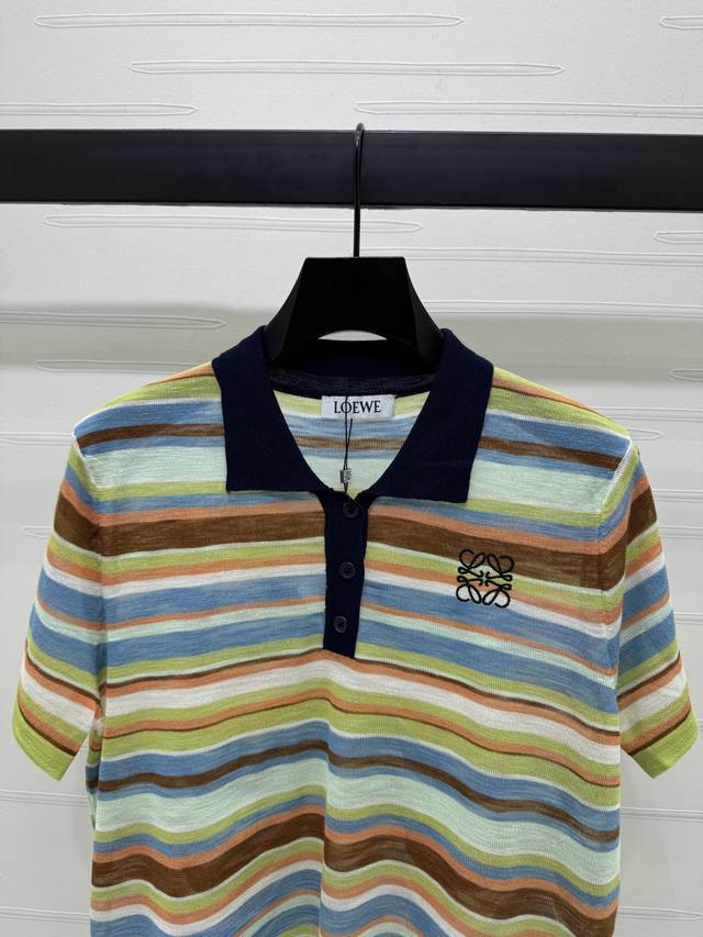 New, original, high-quality Loew* 2025 Early Fall collection! Colorful striped knit short-sleeve top! Woven from custom wool yarn, it's soft, comfortable, and stylish. Lapel knit short-sleeves are cut for a relaxed, relaxed look. Colorful stripes throughout create a romantic, free-flowing, and fresh look. Black embroidered totem trims along the front of the collar add a youthful touch. Perfect for layering in all seasons! Available in one color! Sizes SM-L3! High-quality, bulky stock A706B340C