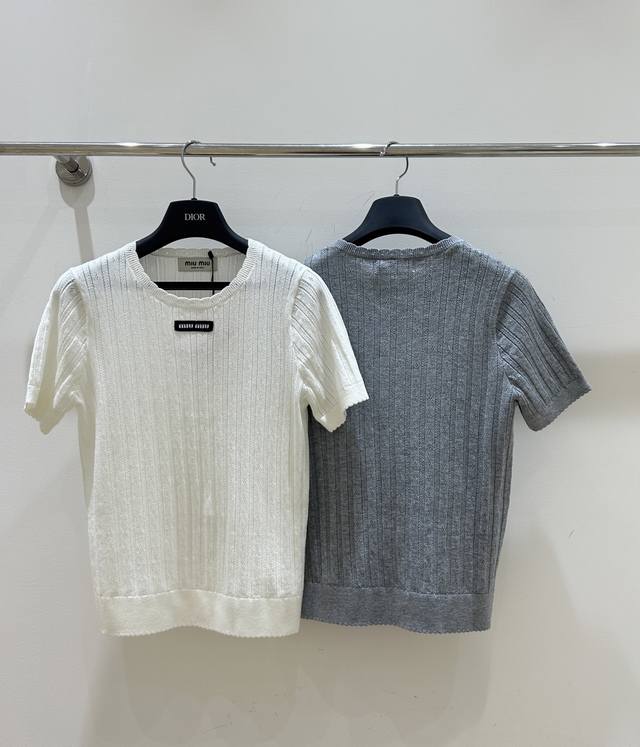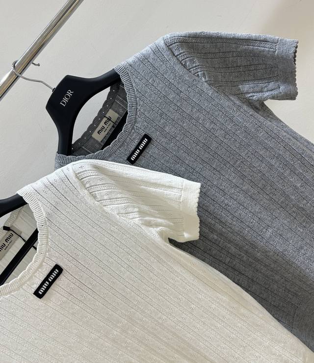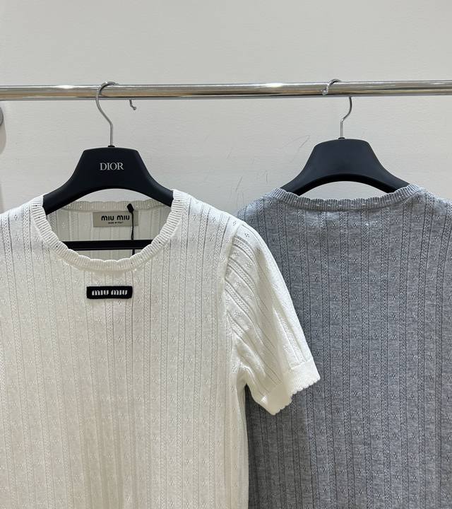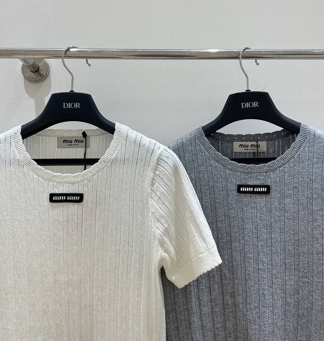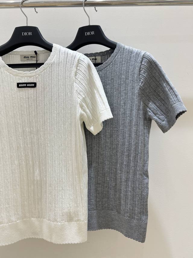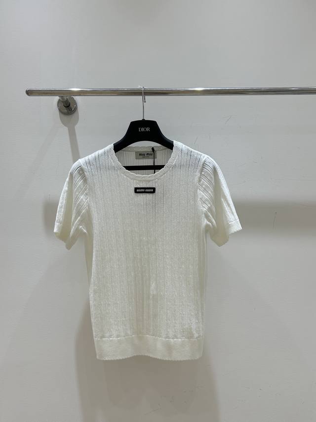 New summer model, simple and clear Miumiu style short-sleeved shirt, letter patch and lace round neck combination, hollow knitted design, cool and breathable, short-sleeved style, fashionable and comfortable.