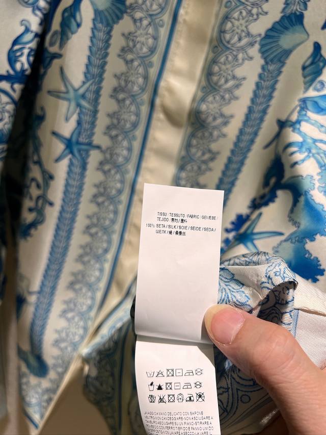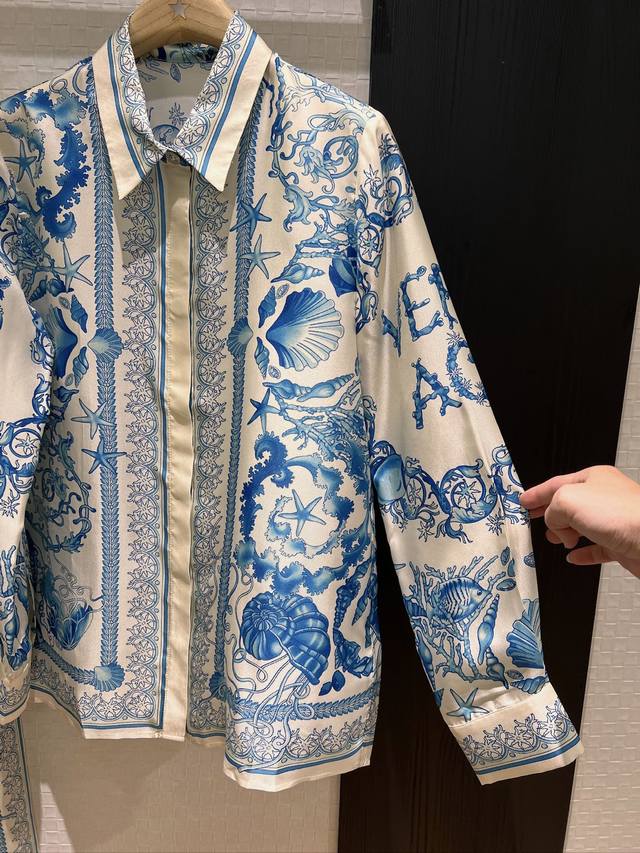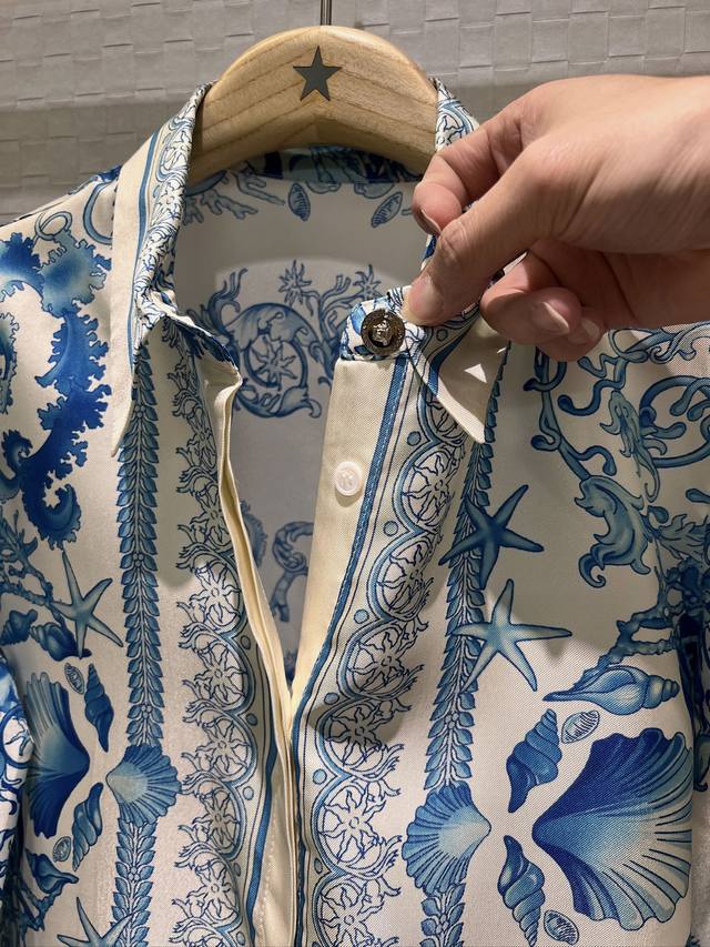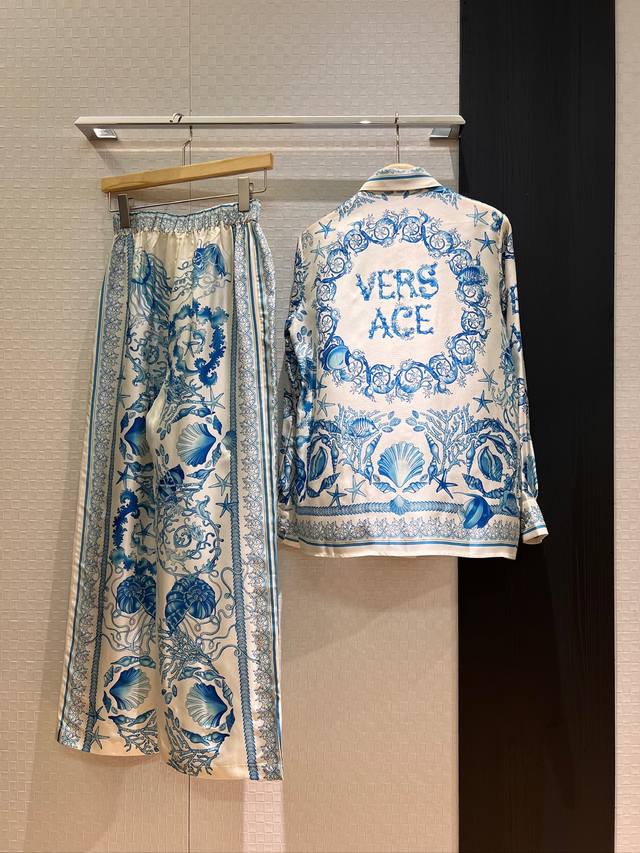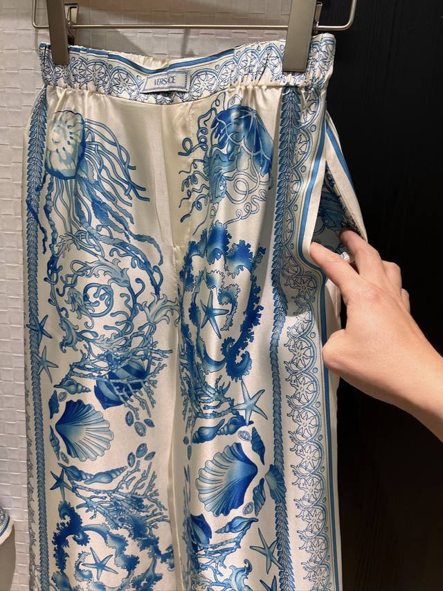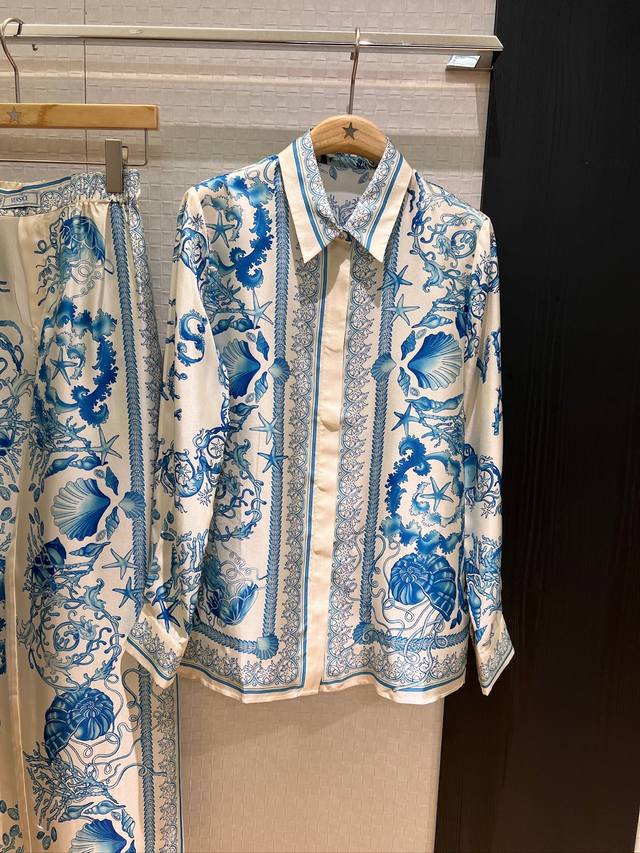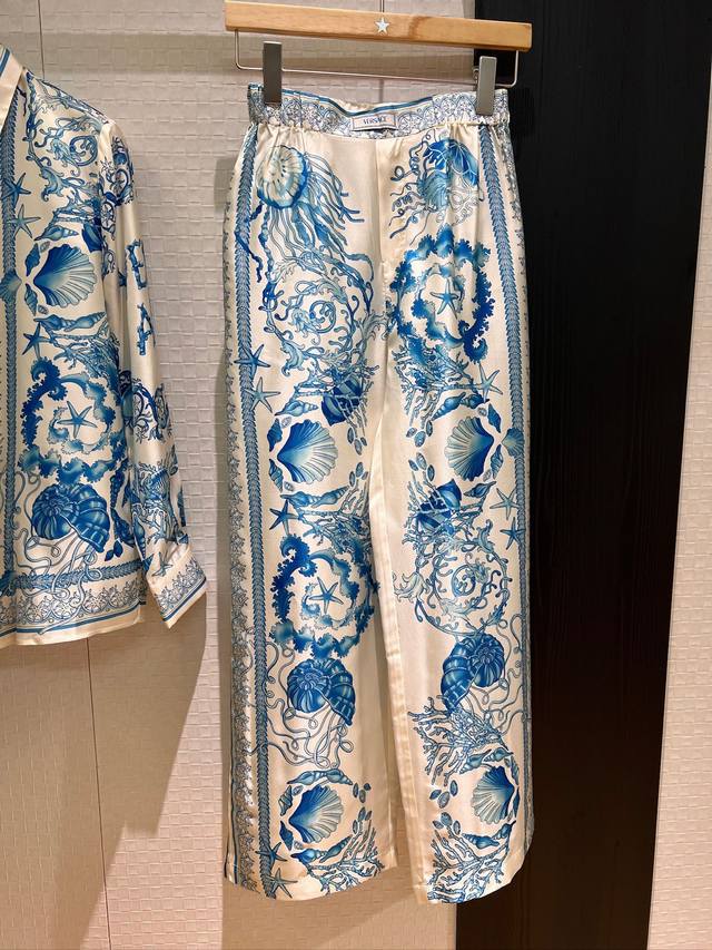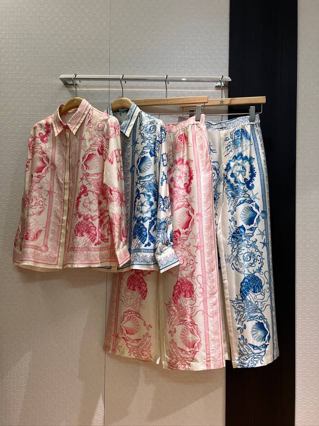 shirt and pants new style starfish shell positioning print silk twill shirt positioning flower silk wide-leg pants elastic waist with pockets on both sides Medusa button Logo label decoration temperament age reduction can be worn as a set or separately yellow blue pink S-Xl