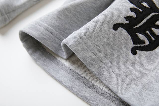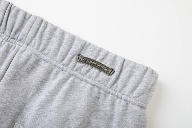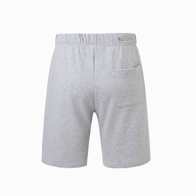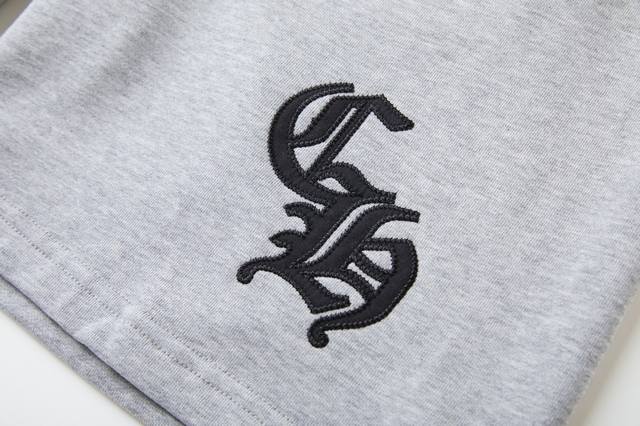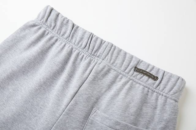 sizes SML, unisex, in stock, available for pickup the next day. Ch 25, gray shorts with Sanskrit logo. Custom-dyed gray fabric. Priced at P. Extremely high. Out of stock. Embroidery using imported embroidery scrolls and hardware accessories.