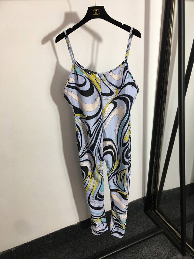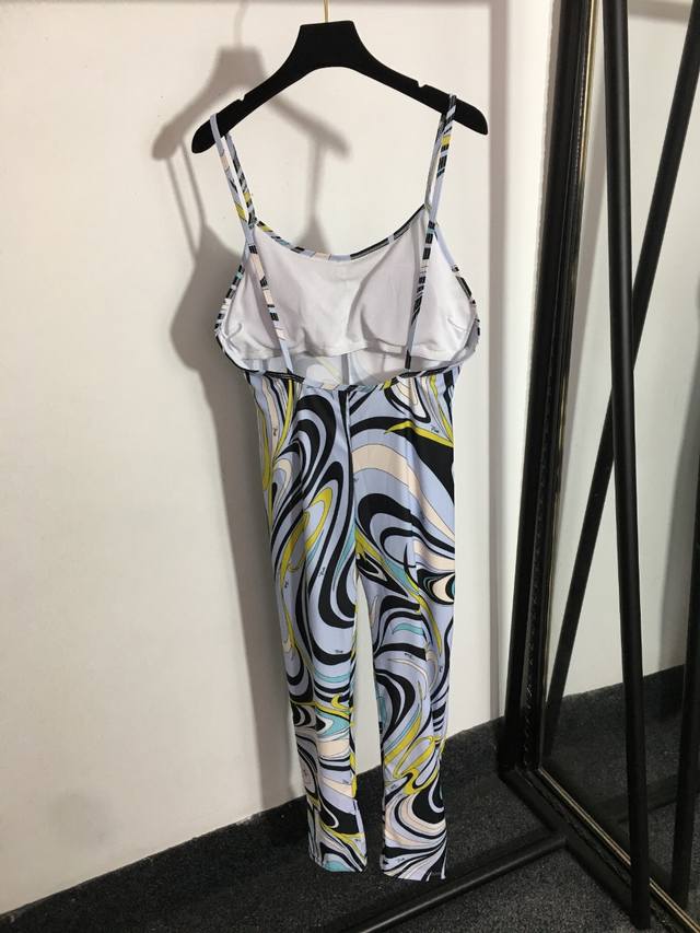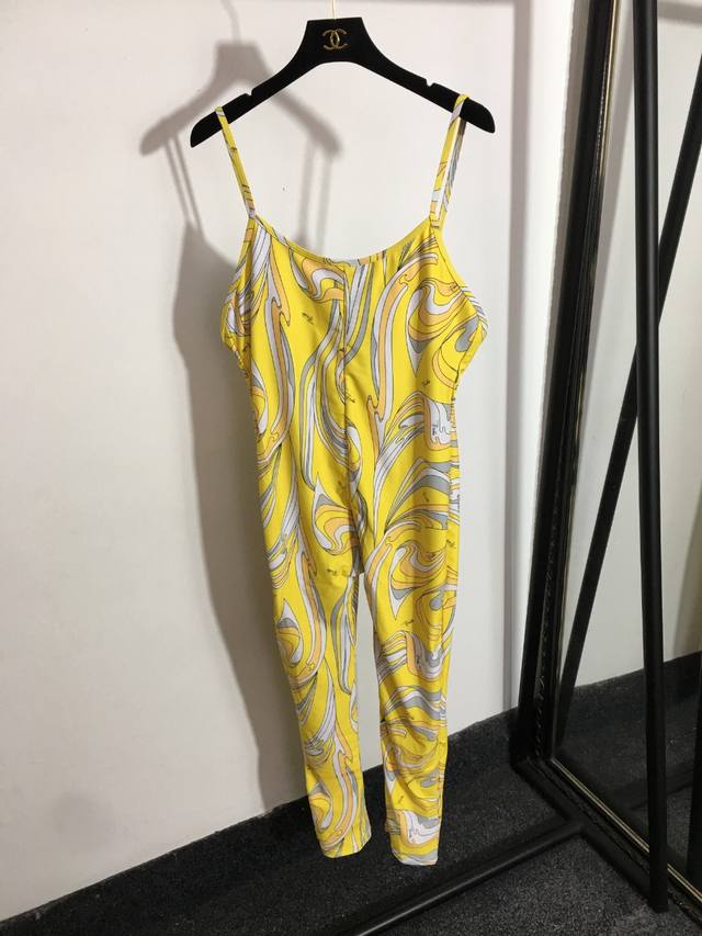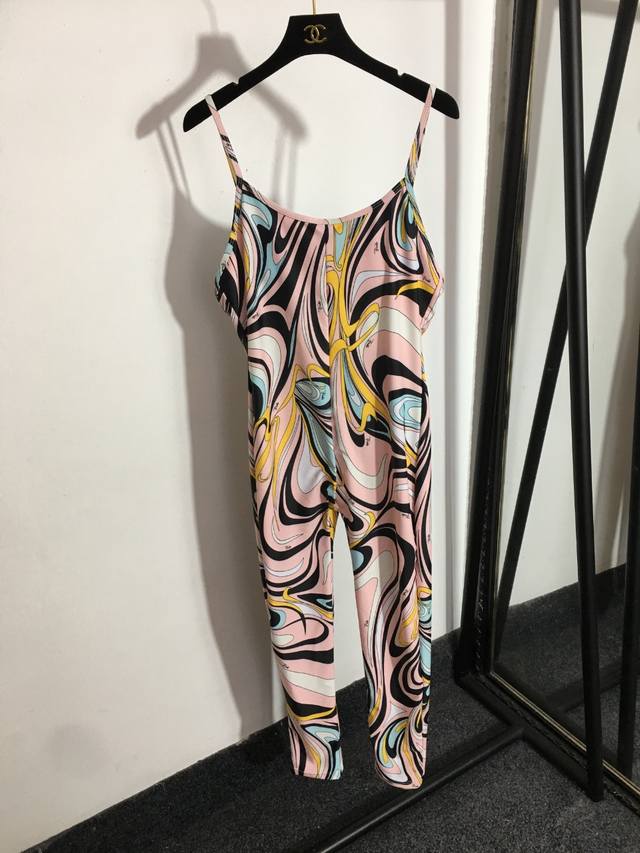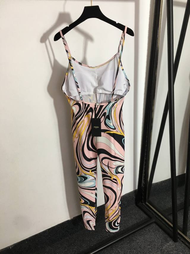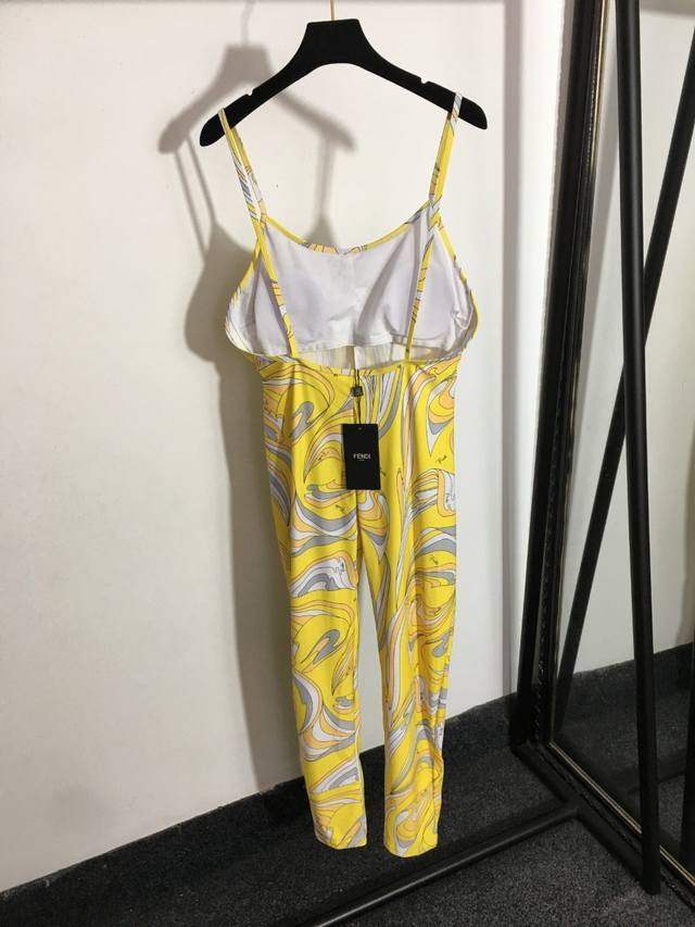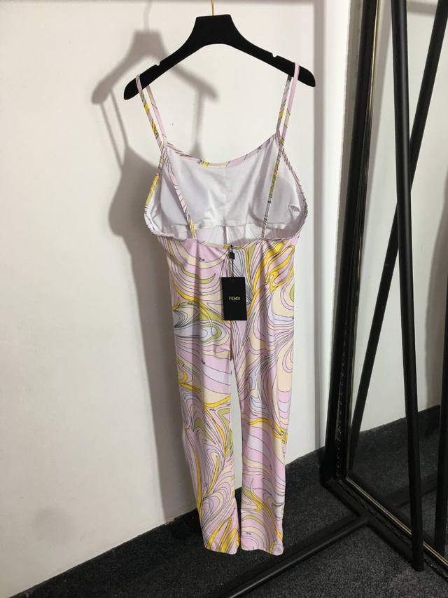 Style 2327 Fend* new abstract print suspender jumpsuit, pink black, yellow, pink yellow, blue, S-Xl, M size; bust 82, total length 125
