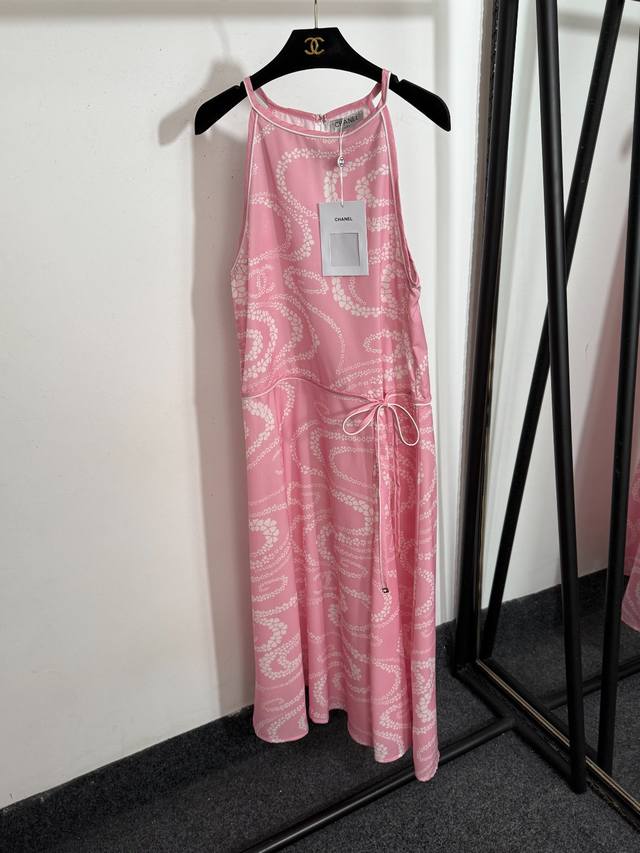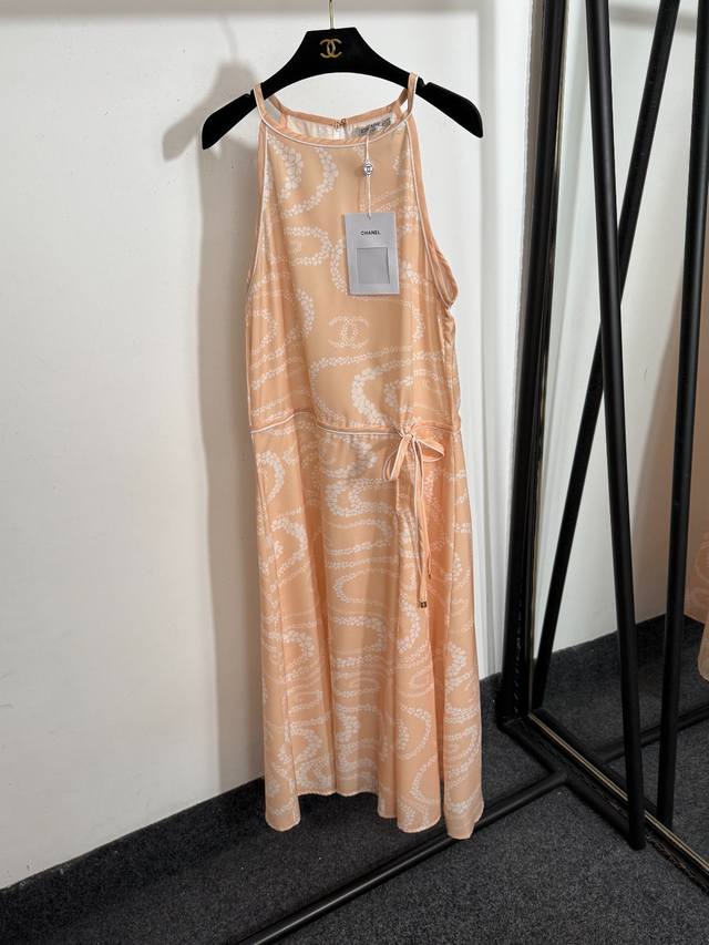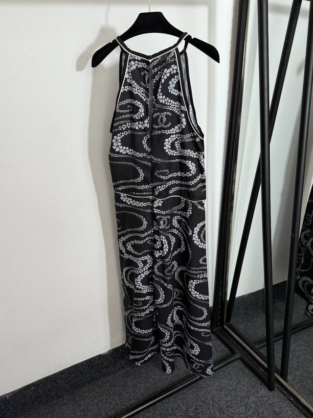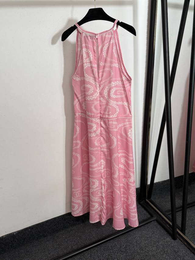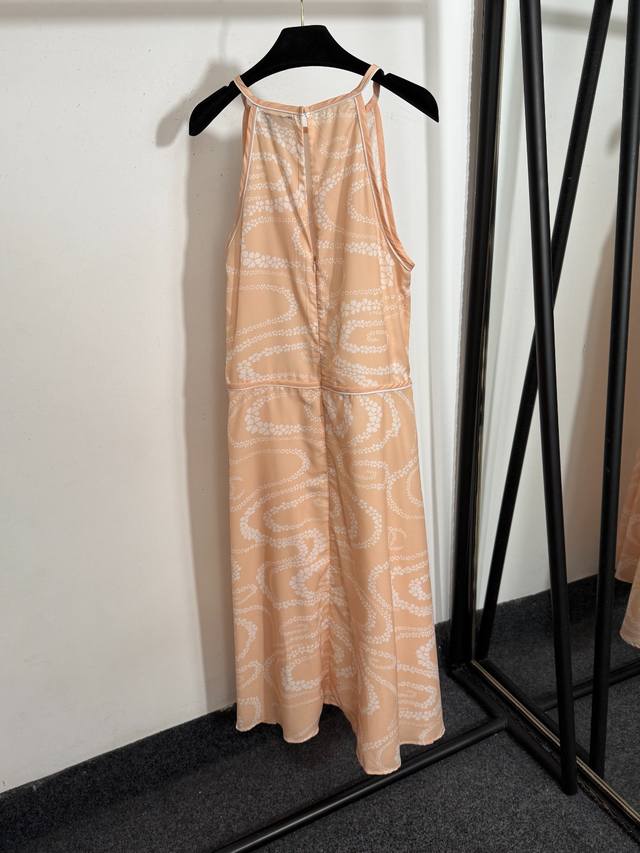 Style No. 20253702 Chane* new camellia fluid print small fragrance style halter neck waist sleeveless vest dress, black, light orange, pink, Sml, M size: bust 90, waist 88, length 125