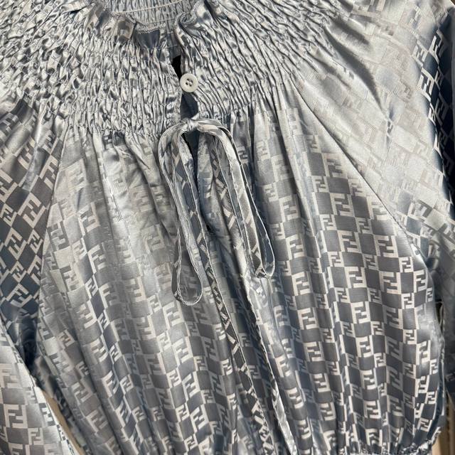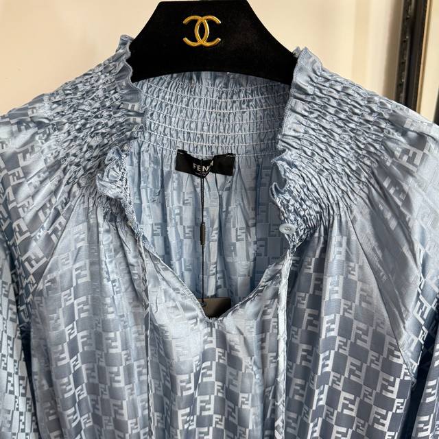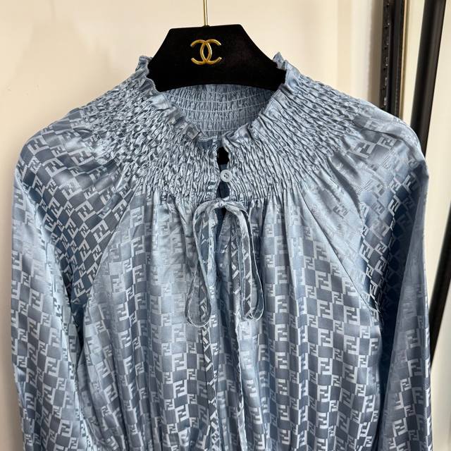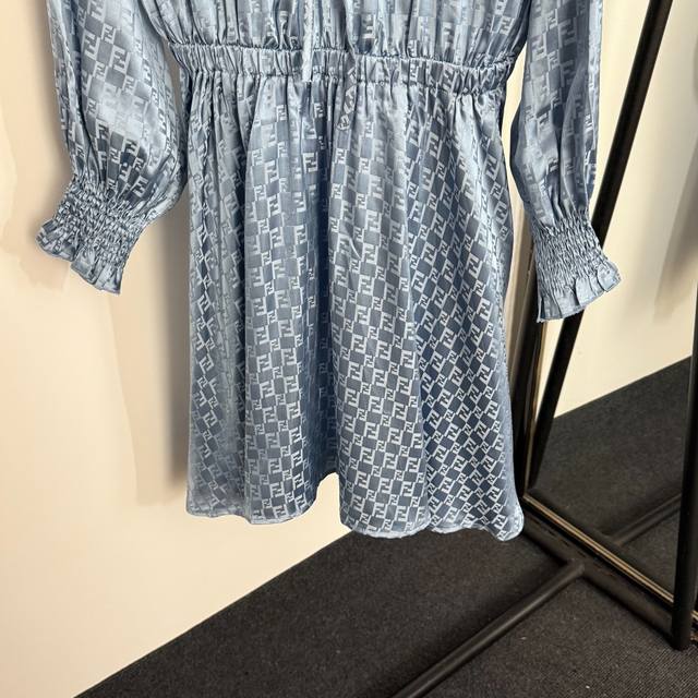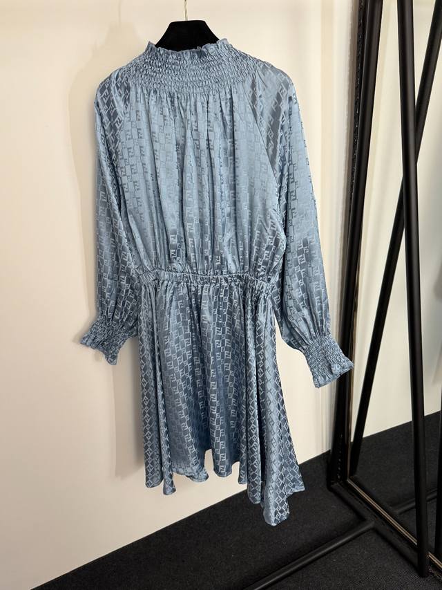 Style No. 20254305 Fend* new monogram F letter jacquard elastic waist stand collar long sleeve dress, blue, Sml, M size; chest 98, waist 66 elastic, sleeve length 64, skirt length 96