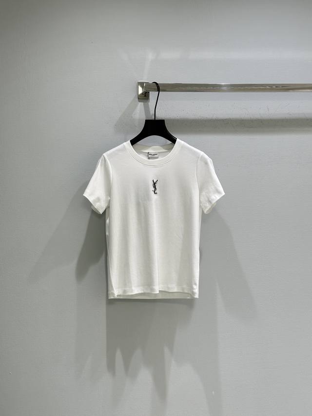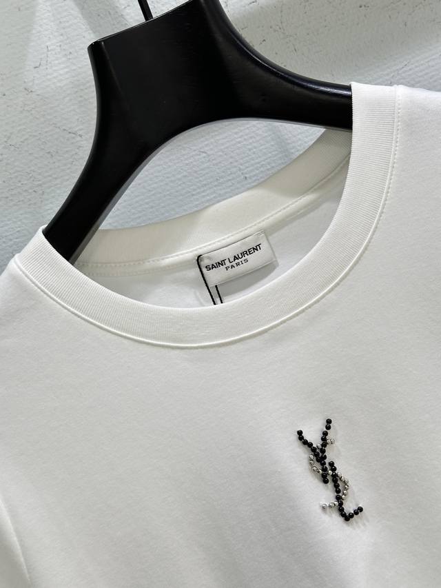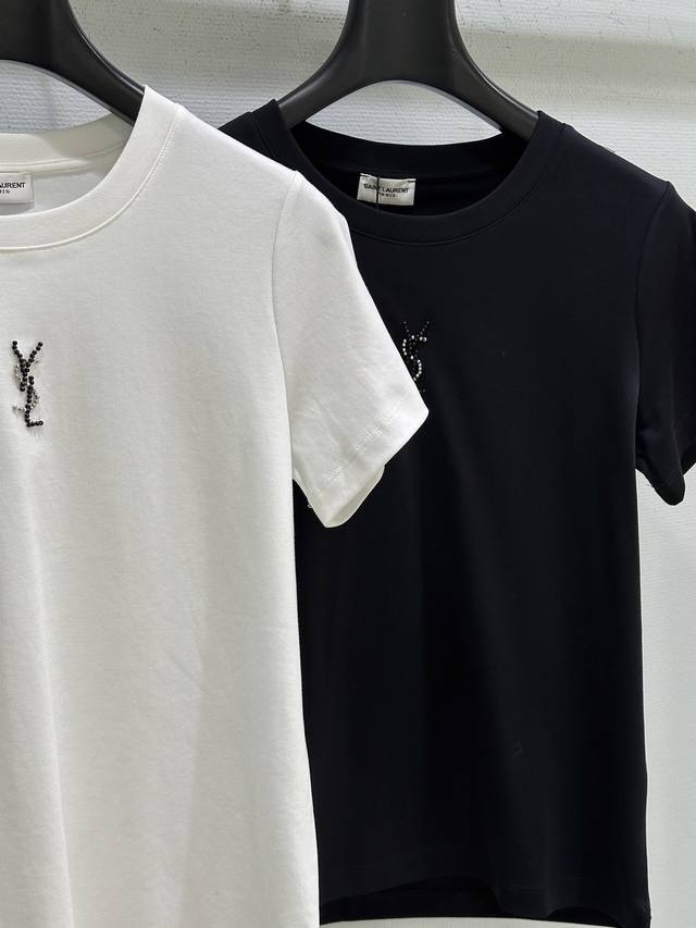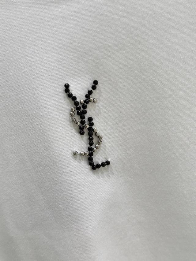 26Ss Early Spring New Arrival! This T-shirt is made of pure cotton, soft and comfortable, super cool and refreshing for spring and summer! Features classic "YSL" beaded rhinestones on the chest, a fitted, straight-shoulder design, slimming and versatile~ Available in white and black, S, M, L, DDD