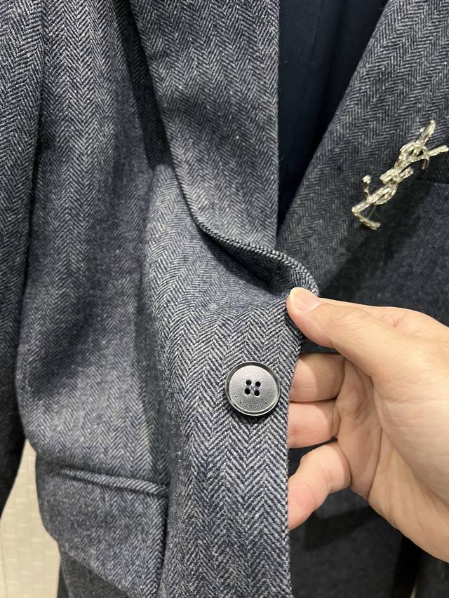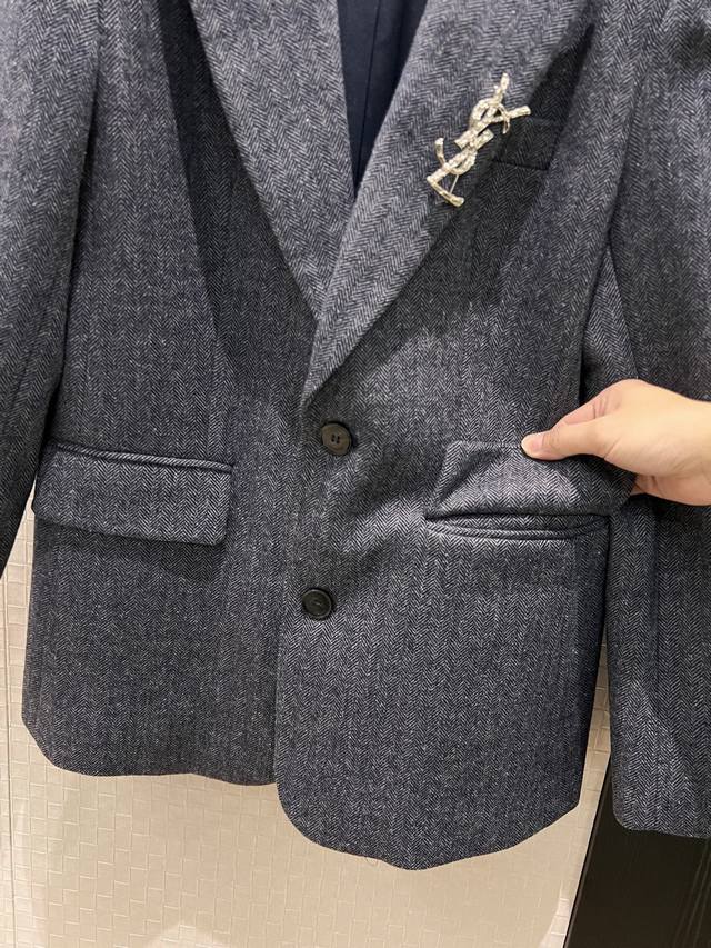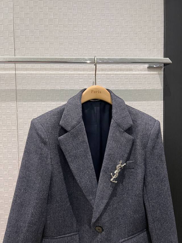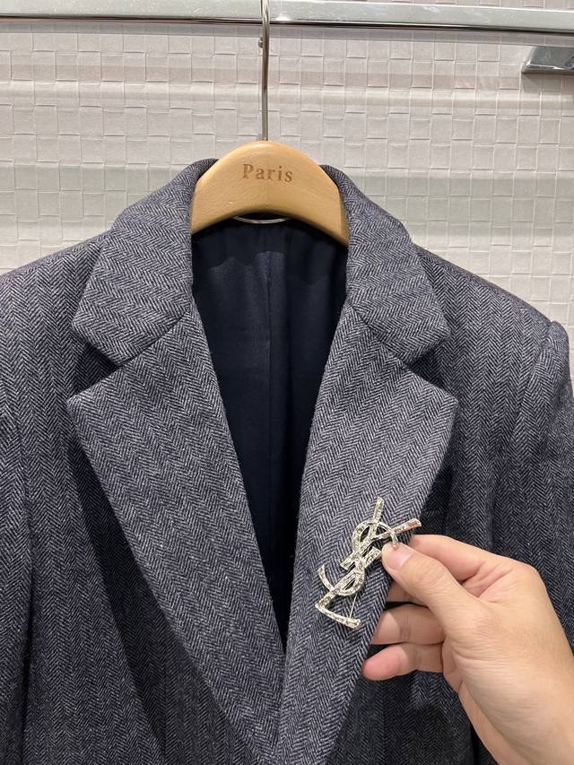 New Arrival: YSL Brooch-Embellished Two-Button Human Print Wool Suit Jacket - High-End Gray Style, Minimalist Chic, Perfect for Commuters - Sml