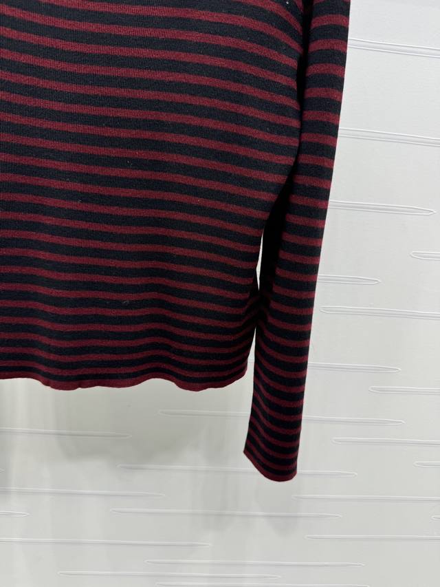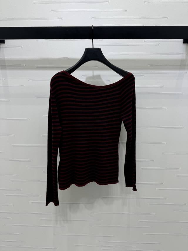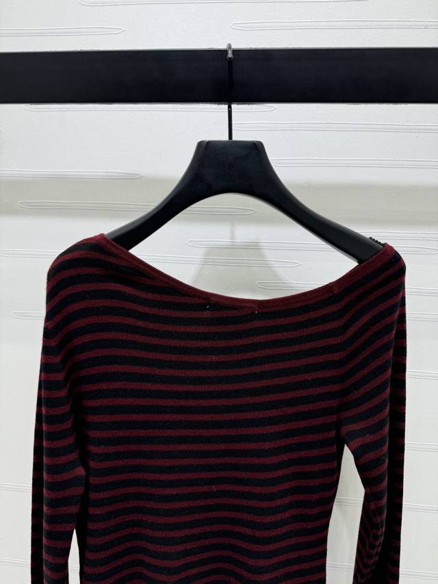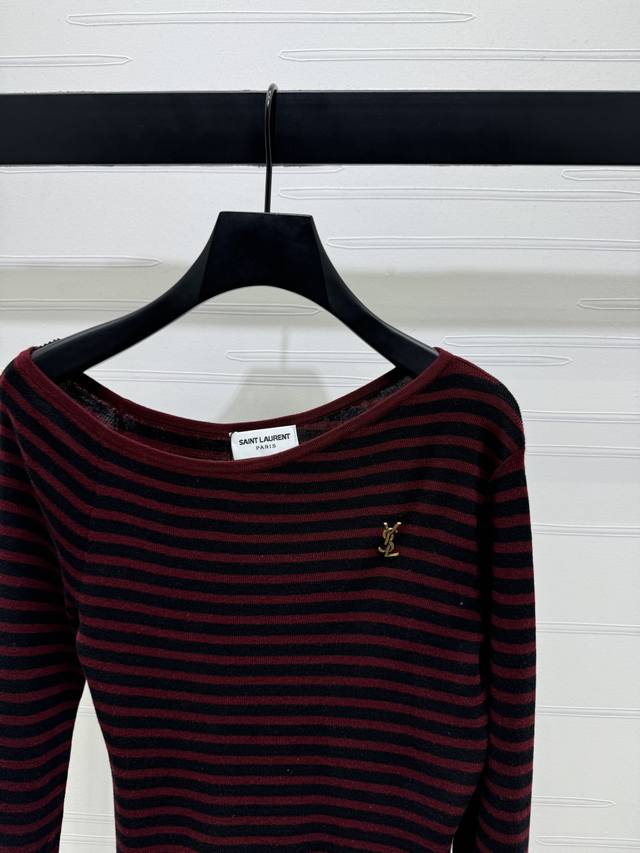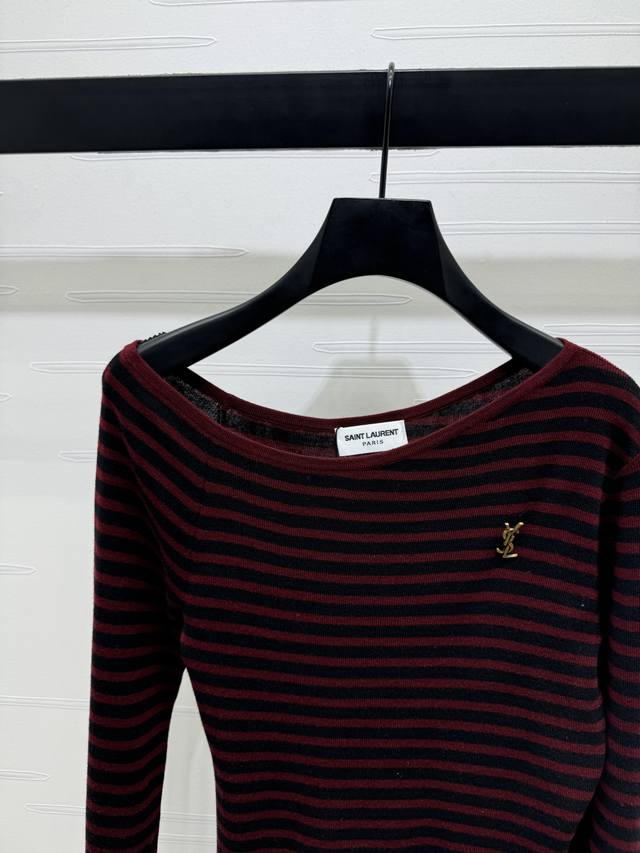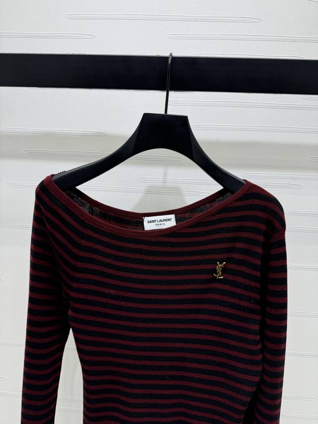 New, original, high-quality Ysl* 2025 Early Fall collection! Striped off-shoulder long-sleeved top! Custom wool material for a comfortable, stretchy, and wearable look. Irregular off-shoulder, flat-cut, round neck, long-sleeved base cut with two-tone stripes throughout. Versatile and durable. Signature chest logo accents add a touch of luxury. Slim fit, tailored to your body, flattering and elegant. Perfect for fall and winter innerwear, perfect for everyday commuting, dating, and casual wear. Available in two colors! Sizes SM-L3! High-quality, bulky stock A706B320C