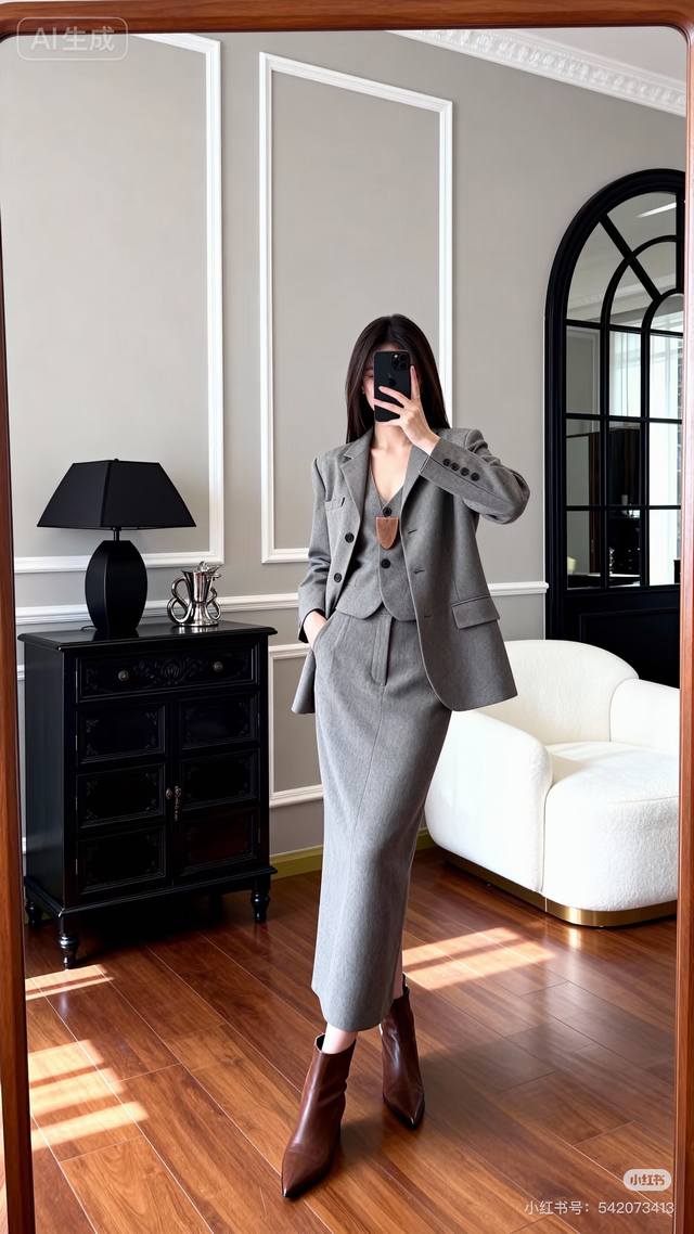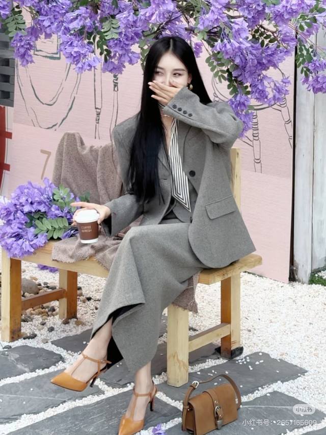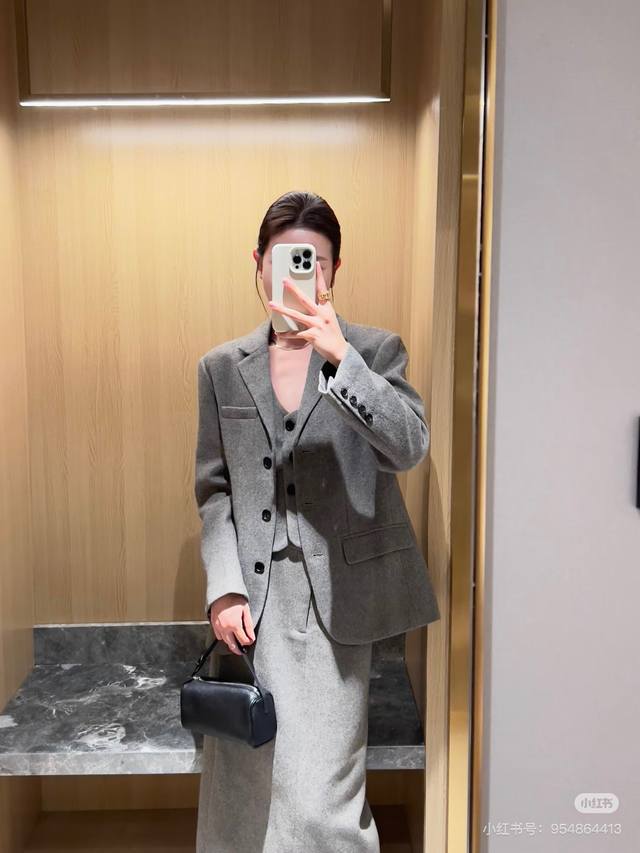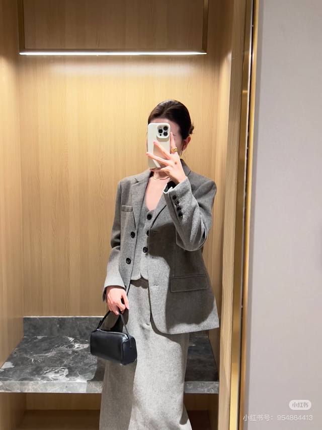 Saint Laurent Winter New Arrival! High-end custom-made thickened woolen fabric stylish three-piece set! Single-breasted lapel loose-fitting fashionable suit jacket with brooch included; slim-fit V-neck vest with button-down zip-up placket; high-waisted pencil skirt; long skirt! Gray. Suit size: M: Shoulder width 42 (with shoulder pads), Bust 110, Sleeve length 58, Jacket length 70. Vest size: M: Bust 88, Jacket length 50. Trousers size: M: Waist 72, Hips 92, Skirt length 86.