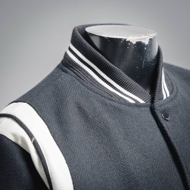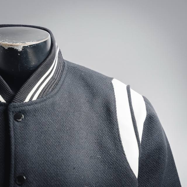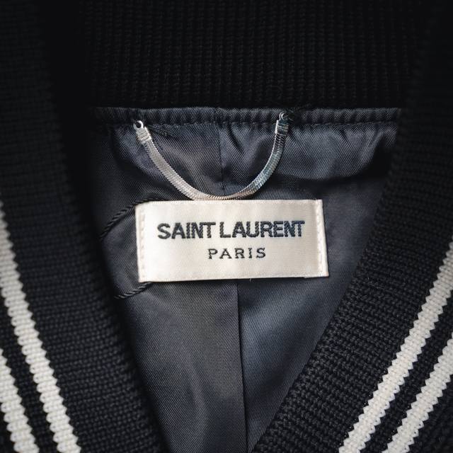 Saint Laurent Paris YSL Classic Black and White Baseball Collar Jacket. Original 1:1 replica, the highest quality version online, taking 2 months to develop. Made with pure wool fabric and jacquard ribbed knit