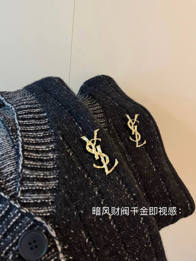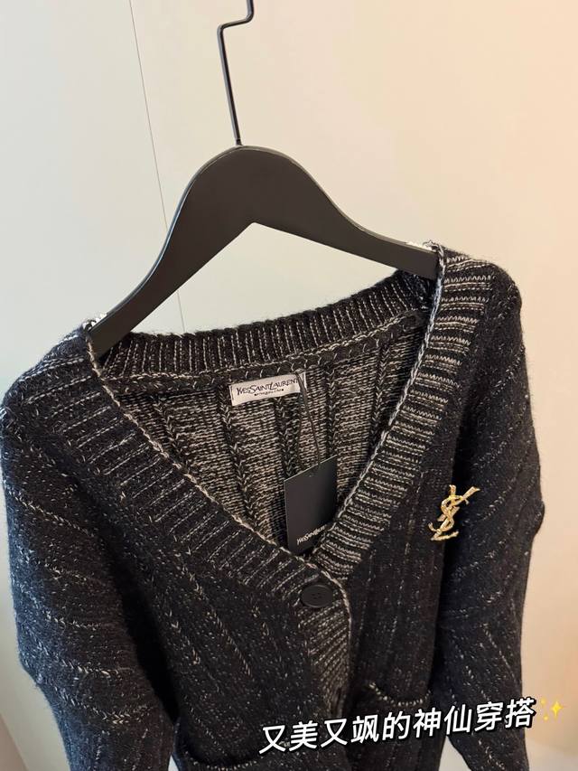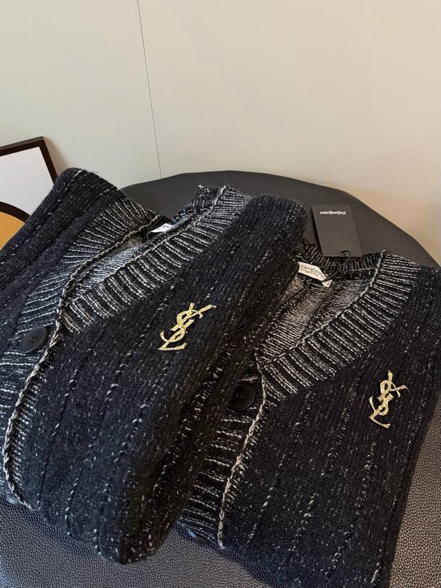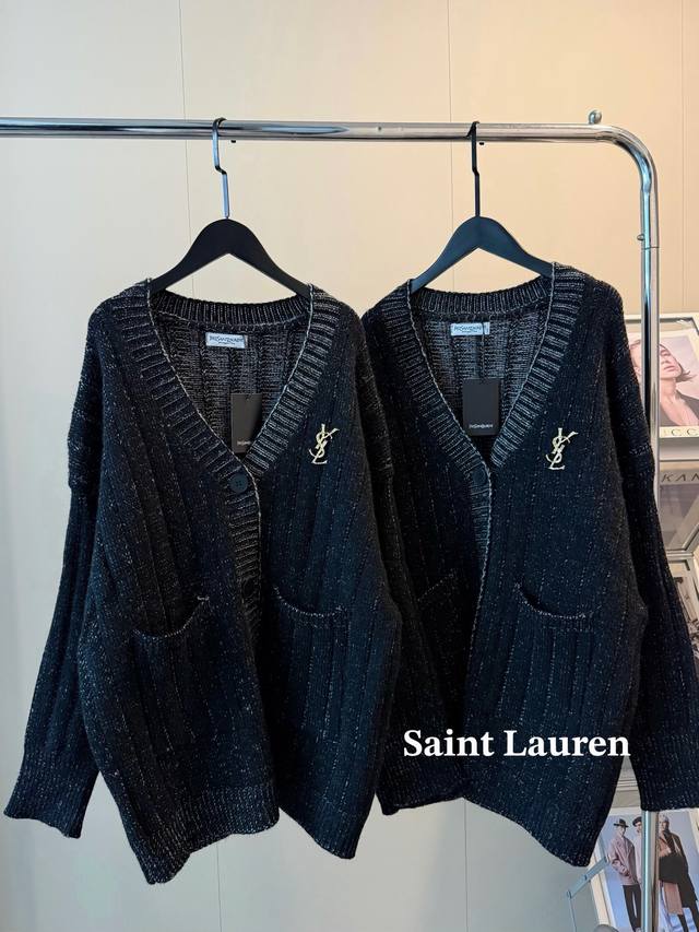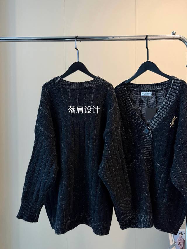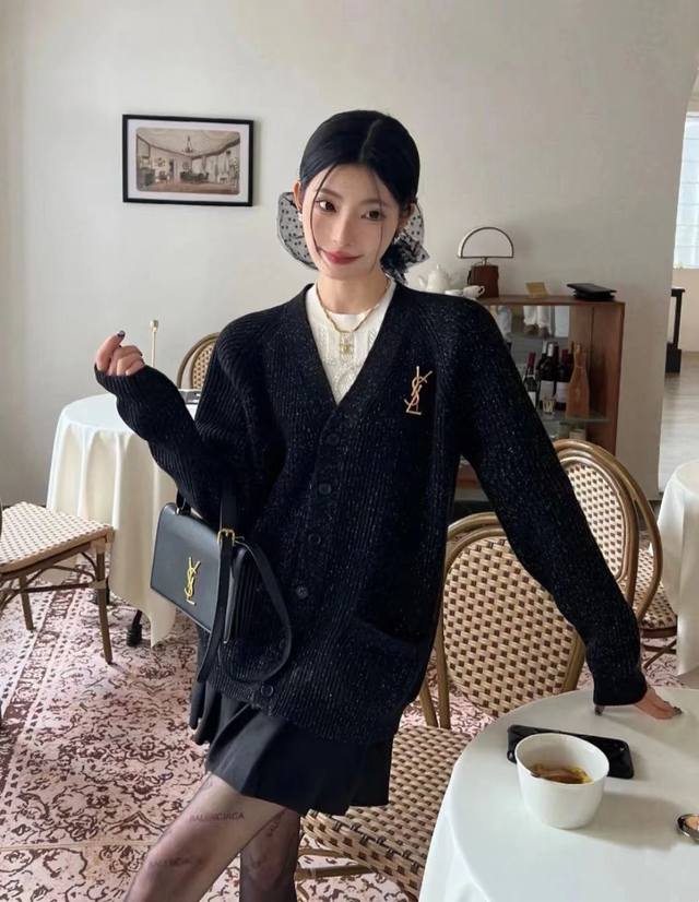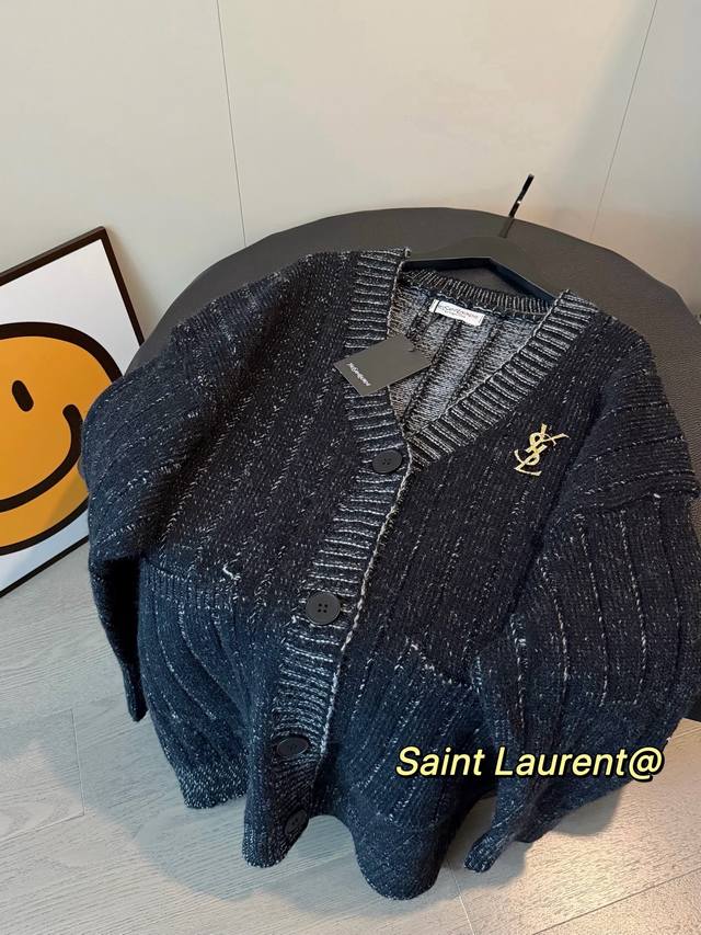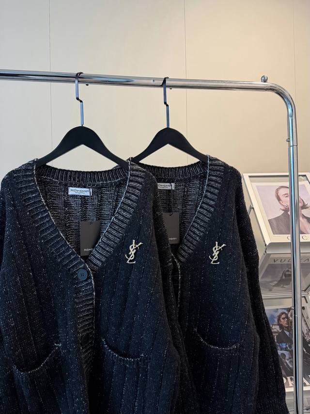 YSL Limited Edition Wool Knit Cardigan Sweater - A stunningly beautiful and chic outfit that will captivate both men and women! The entire garment subtly reflects light, creating a shimmering, starry effect. It evokes the image of a sophisticated heiress: paired with black stockings, it exudes elegance. The wool blend knit fabric is both stylish and warm. The loose fit offers excellent coverage, creating a relaxed yet sophisticated vibe. Color: Black. Size: S, M, L. Loose fit. S: Bust 116cm, Length 72cm; M: Bust 118cm, Length 74cm; L: Bust 76cm, Length 76cm.